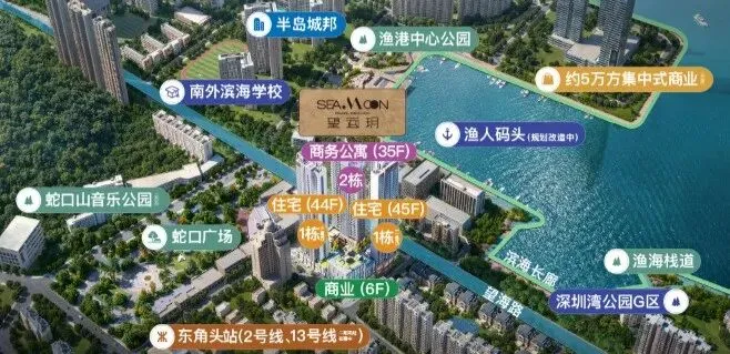 项目位于深圳市南山区,建设内容为2栋44至45层住宅楼、1栋35层公寓楼等,总建筑面积 91523平方米。项目是招商蛇口焕新深圳南山片区的重要一步,将结合蛇口半岛的滨海优势,建设集商业、娱乐、文化、居住于一体的具有滨海渔港风情的高端商业居住区,利用渔港码头、游艇俱乐部等特色元素,传承“渔文化”,充分展现国际海滨城市风情。望海玥家园地处蛇口,周边有半岛城邦、南海玫瑰花园等传统豪宅区!由于该项目地理位置十分优越,与中信东角头项目、半岛城邦五期并称“最值得打的三大新盘”