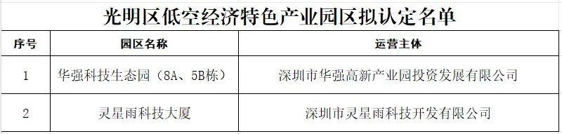 关于光明区低空经济特色产业园区(2026年创建类第一批)公示名单