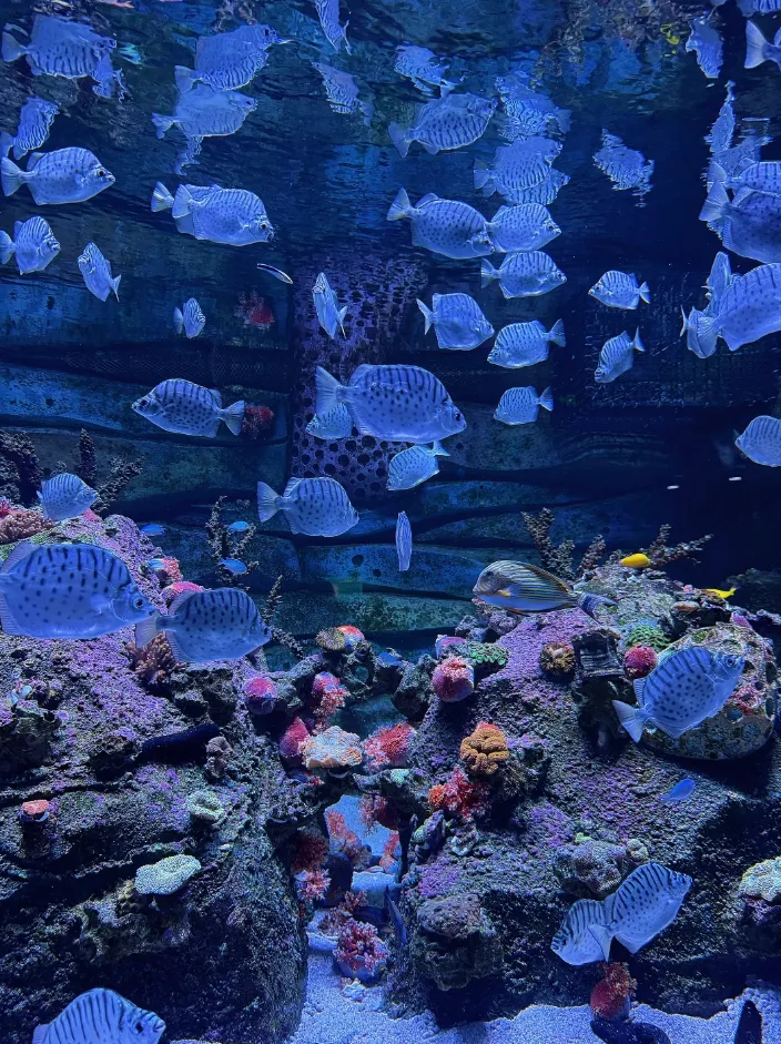 青蓝洞大厅,拥有国内最大的圆柱形展缸,展示着数万尾沙丁鱼及深海鱼类,呈现出“海底沙丁鱼风暴”景观。结合声电光、投影技术,沉浸式感受深海魅力。鲸豚馆拥有鼻海豚、日本海豚等海洋,精灵徜徉在海水中,并设有科技互动展项,最大的鲸豚剧场也在此处,剧场采用灯光投影激光,舞台机械等高科技方式呈现一场生动的未来科技海洋大秀,见证人与动物的和谐共舞。