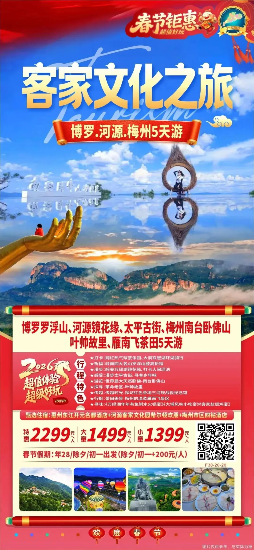 博罗罗浮山、河源镜花缘、太平古街、梅州南台卧佛山、叶帅故里、雁南飞茶田5天游