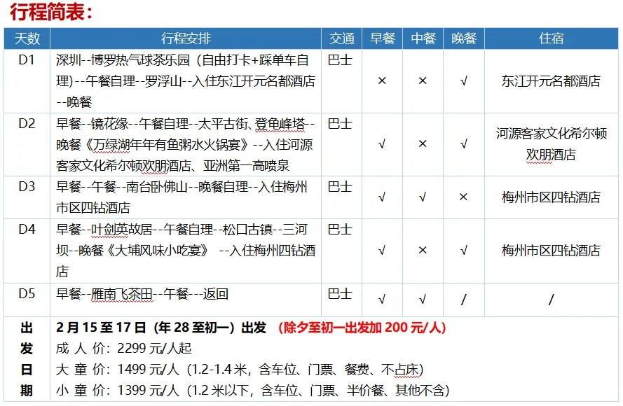 Ø房差:2月15日(年28)出发700元/人,2月16-17日(除夕或初一)出发加收900元/人(团费按2人住双人房定价,单人入住1间需补房差)