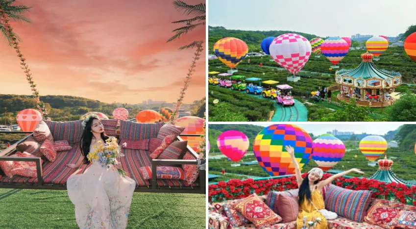 11:00前往【博罗热气球茶乐园】是一个充满浪漫气息的游玩胜地。这里有大片绿意盎然的茶园,1.5 公里的木栈道贯穿其中。乘坐五彩斑斓的热气球缓缓升空,仿佛置身于惠州的 “土耳其”,脚下是连绵的茶园,远处是罗浮山的美景,还能手持一杯客家绿茶,享受 “云端品茗” 的浪漫。在悬崖咖啡厅的二楼户外沙发角,以热气球为背景拍照,满满的土耳其风情。三楼摄影基地有巴厘岛鸟巢、落日秋千等场景,搭配热气球景观,出片率极高。此外,园区内的旋转木马、托马斯小火车等项目,也为这份浪漫增添了几分童趣。(园区内消费自理)