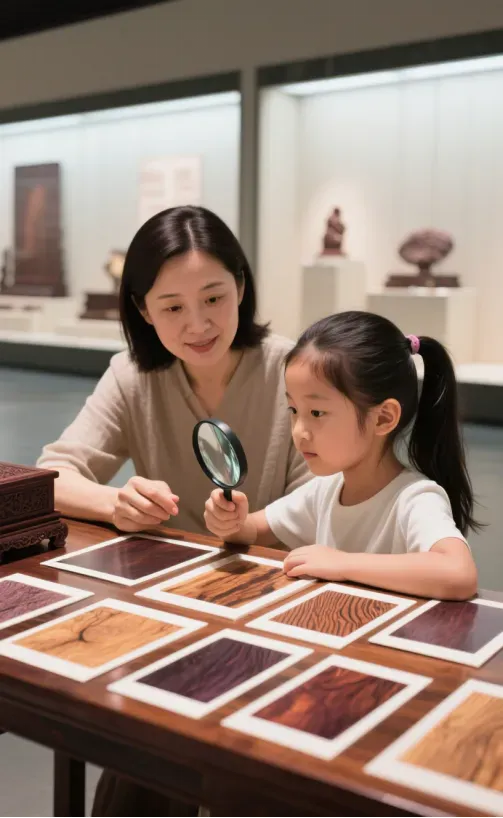 孩子轻触树轮,触摸千年智慧,林中探索,