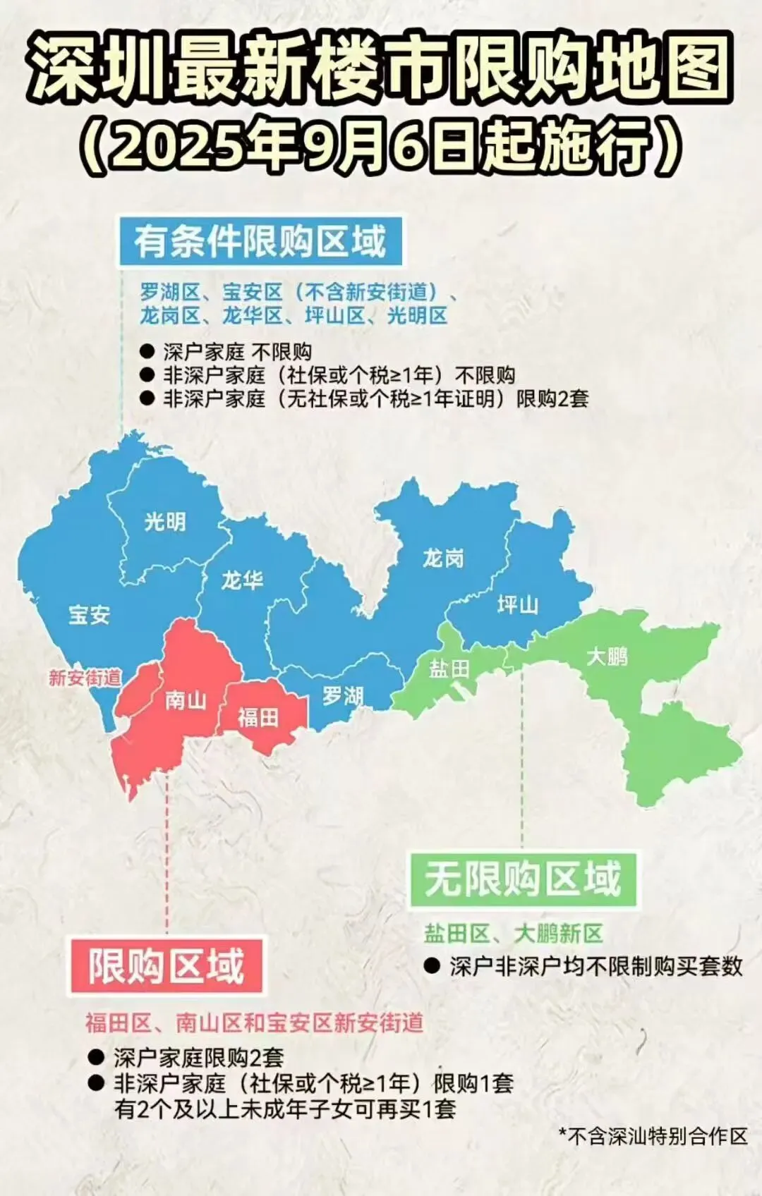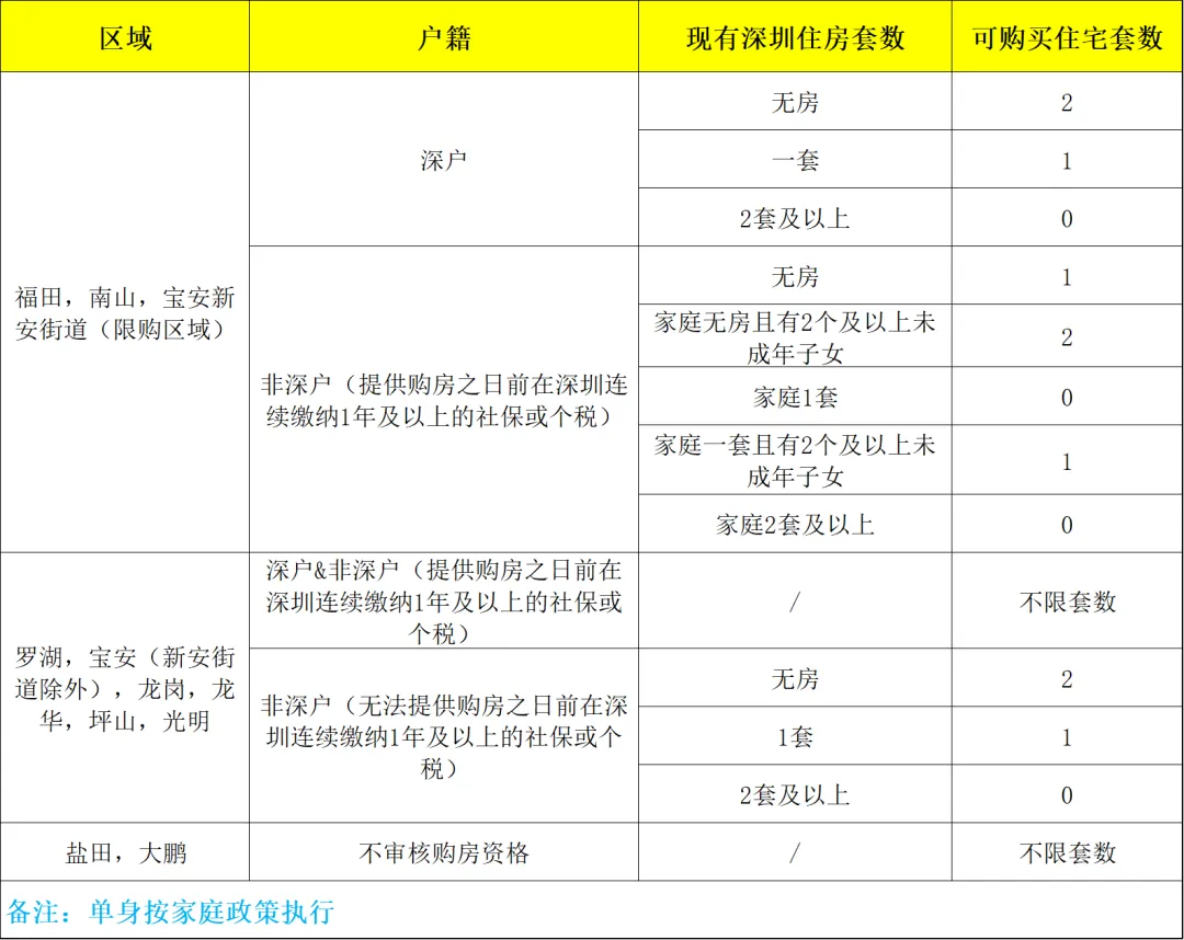 1.南山、福田、宝安新安街道(限购区域),深户家庭限购2套,满一年社保或个税的非深户家庭限购1套(有两个及以上未成年子女家庭,可购买2套),社保或个税不满一年的非深户家庭不具备购房资格。