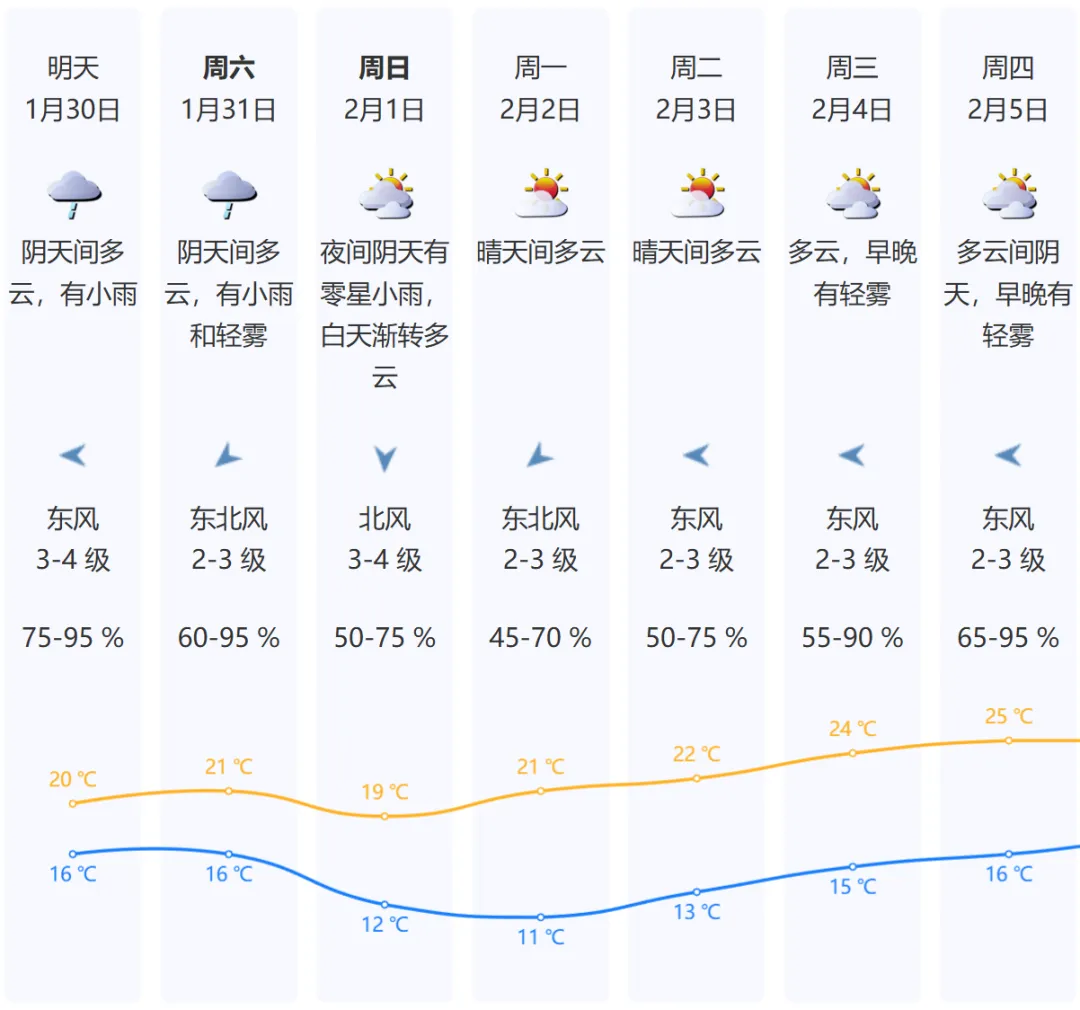 预计30日-31日阴天,有小雨和轻雾,昼夜温差减小;