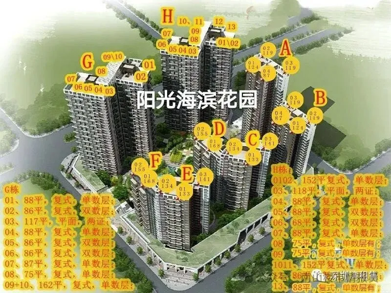 阳光海滨2012年竣工,由19-32层的高层建筑组成,一共10栋,约736户(不含JK栋),其中2栋(J/K)为酒店式服务公寓,这两栋只租不售。小区有单证居多,占比78%,在湾区是比较高的。主力户型为86㎡左右复式四房,以及75㎡复式三房(深圳湾比较入门级的户型),部分113-168㎡的平层户型,单双都有。