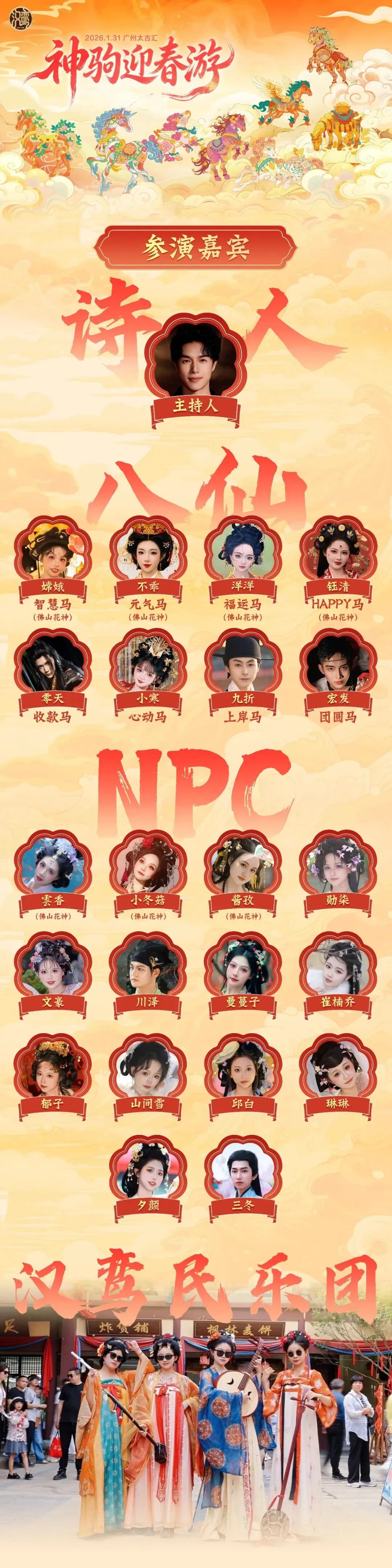 广州太古汇“神驹迎春·花灯锦绣”新春艺术展,其开幕系列活动 “神驹迎春游”汉服快闪,将带领我们入画寻仙,亲历“新八骏传说”。这并非一次简单的巡游,而是一场由我们共同推进的剧情体验:从瑶池觅仙启程,于游园中互动获礼,至最终八骏齐聚、共绘现代画卷,全程乐舞相随,福礼相赠。