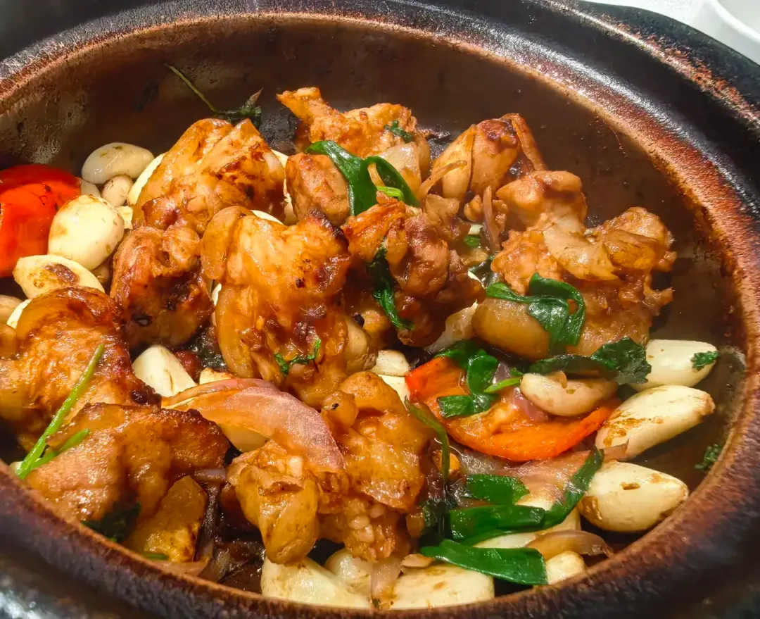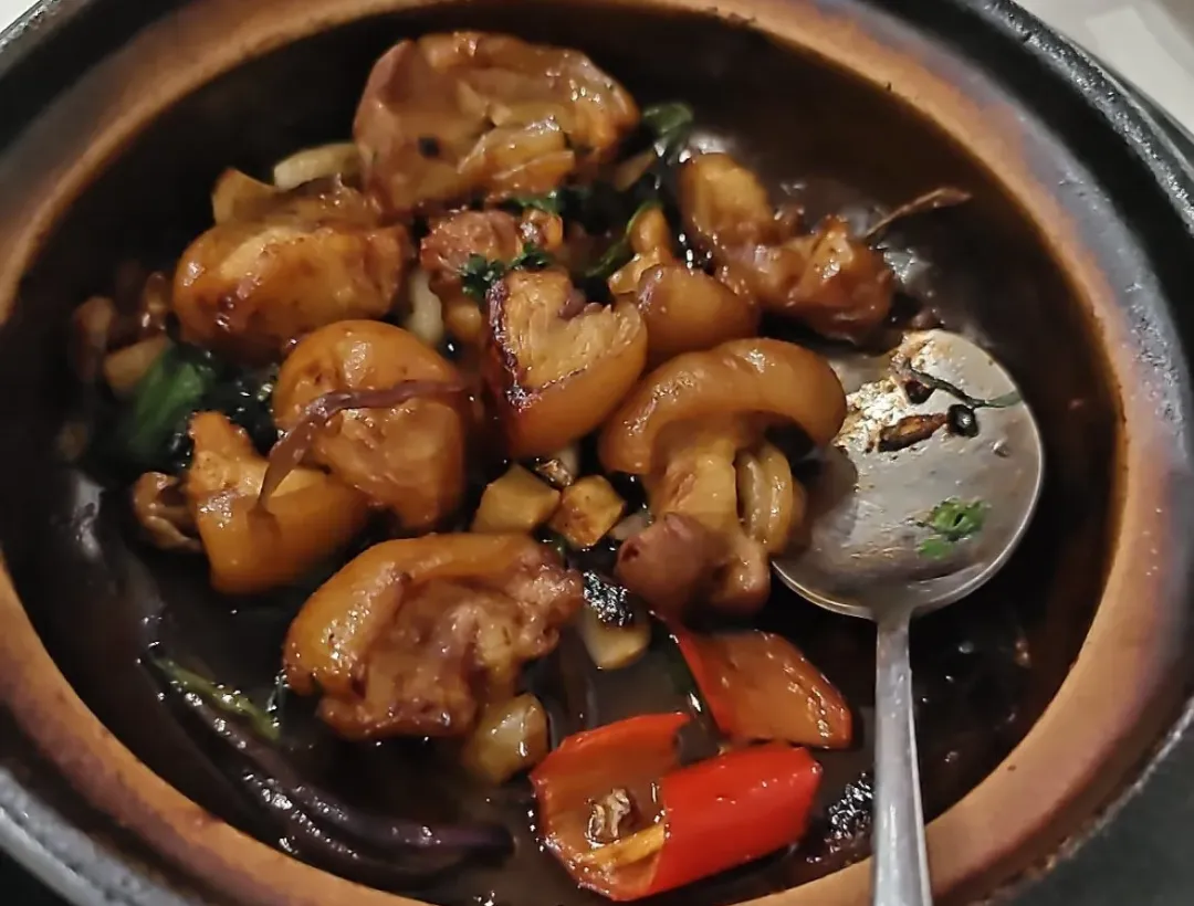 啫啫拆骨猪手:猪手在砂锅里啫得油亮焦香,酱汁裹着每块肉,混着红辣椒和紫苏的香气。猪手炖得皮糯肉烂,胶质粘嘴,拆骨后吃着超爽!