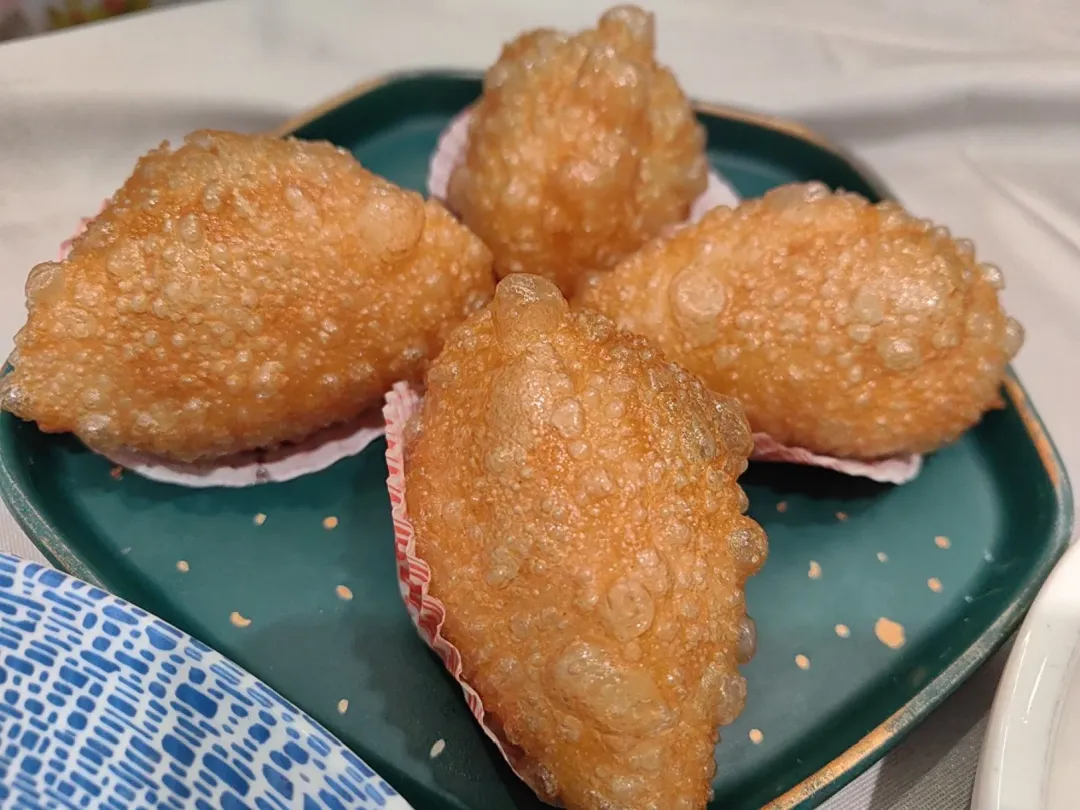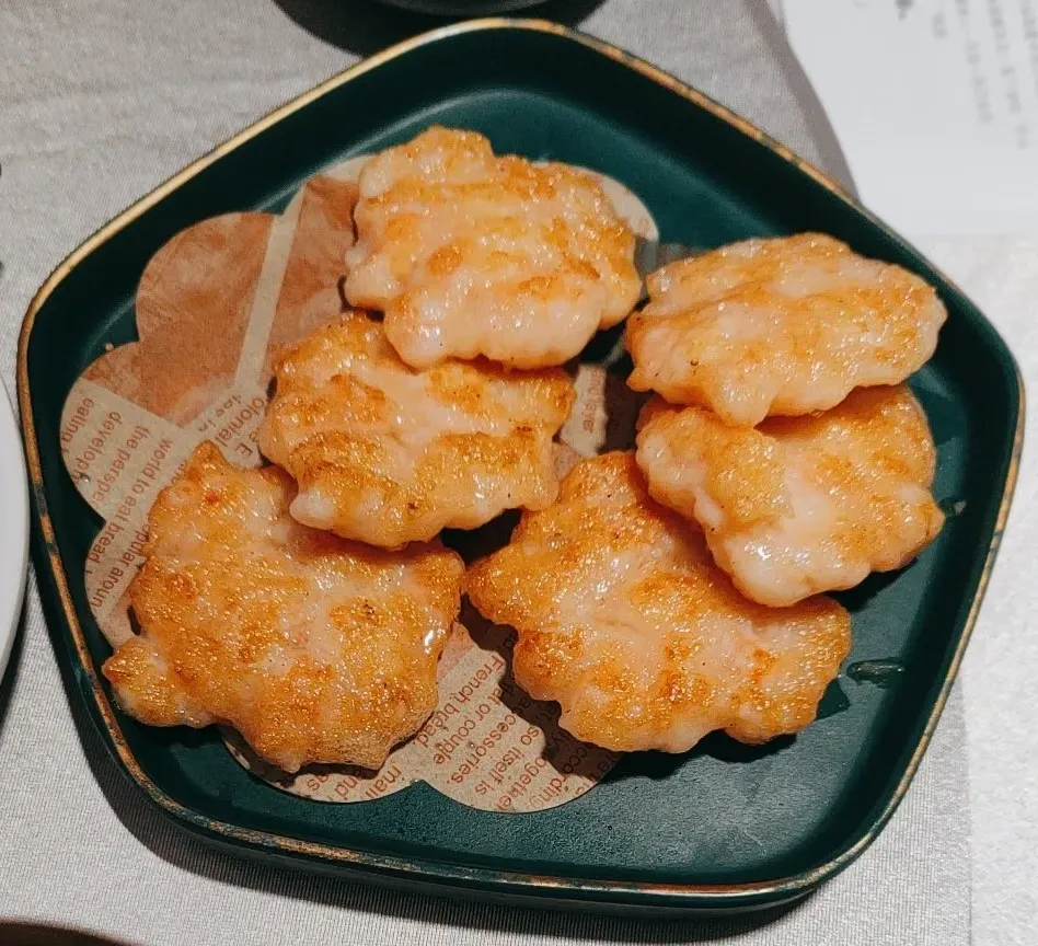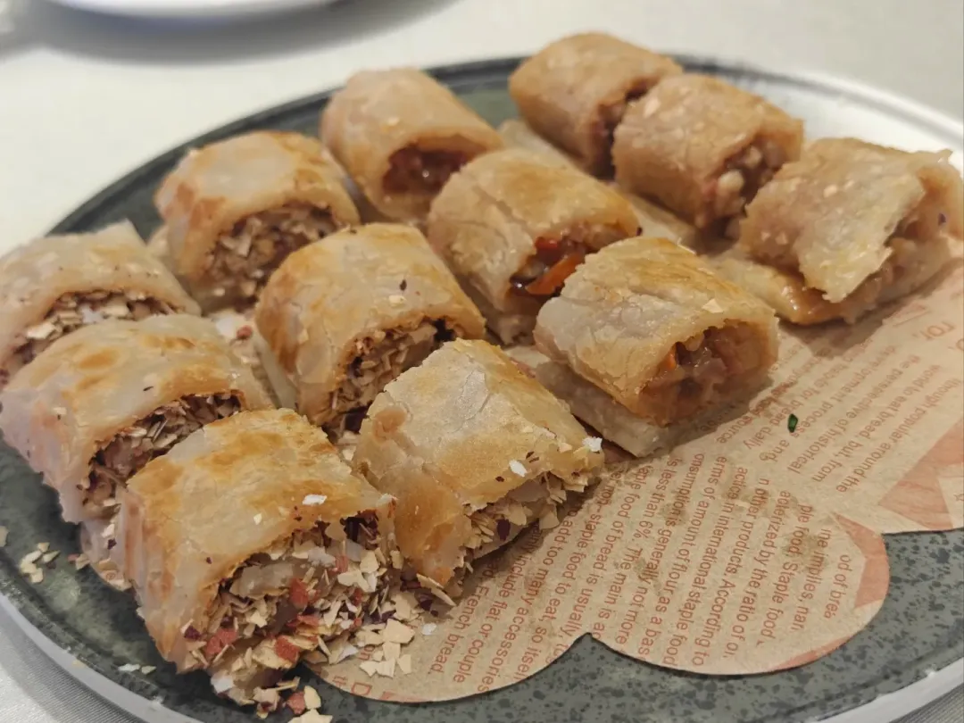 红曲米脆肠:红亮通透的红曲米皮裹着酥脆的网皮和弹牙的虾仁,三重口感直接在嘴里炸开!咬下去先是红米皮的软,接着是网皮的脆,最后是虾仁的弹,蘸上酱吃,香得停不下来!