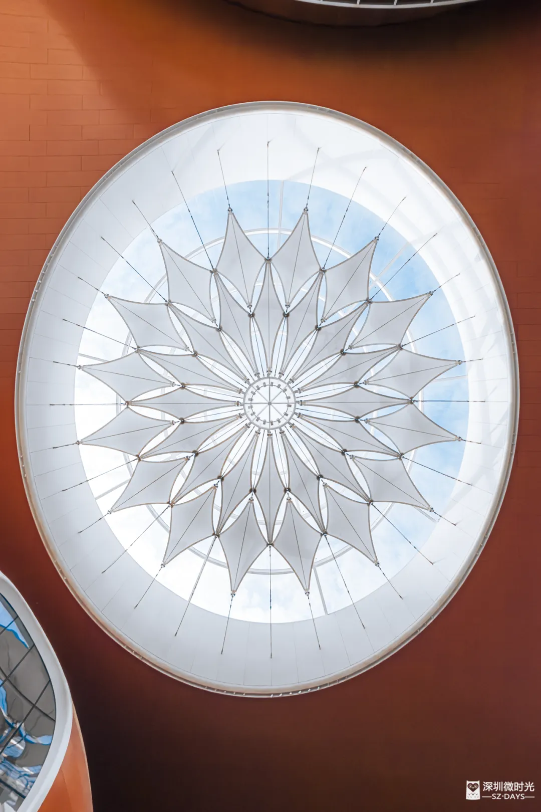 抬头看,上方是1000平方米的圆形张拉膜,以花瓣为型。光线透过玻璃洒下来,既保证了充足的采光,又让这个巨大的空间显得格外灵动。