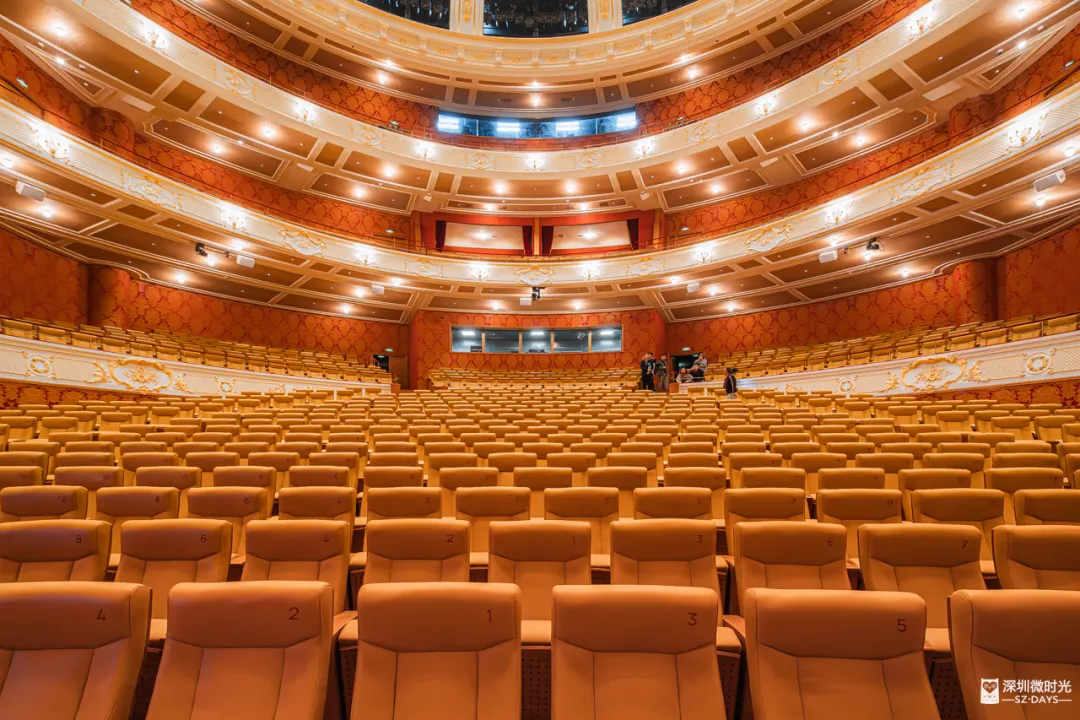 走进西侧1500座的歌剧厅,满眼都是红丝绒配香槟金。金碧辉煌的仪式感,就是这么实在。