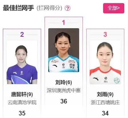 刘玲:拦网得分榜第1️⃣,副攻榜第2️⃣