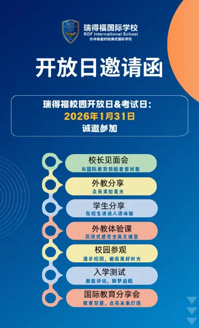 1月31日,瑞得福国际学校「校园开放日&考试日」即将盛大开启!我们诚邀所有关注国际化教育的家庭走进校园,一起探索美式教育的独特魅力。