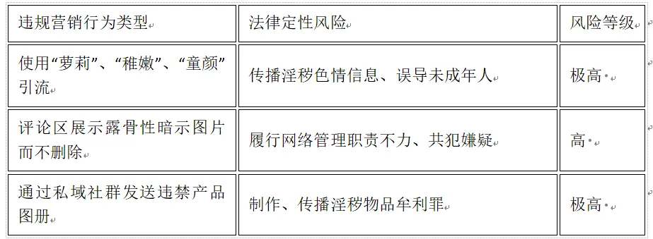 许多东莞企业的刑事风险源于营销人员在电商平台上的违规引流。根据2008年《最高人民检察院、公安部关于公安机关管辖的刑事案件立案追诉标准的规定(一)》,利用互联网传播淫秽电子信息(包括产品图片、详情页描述)具有极低的入罪门槛 。