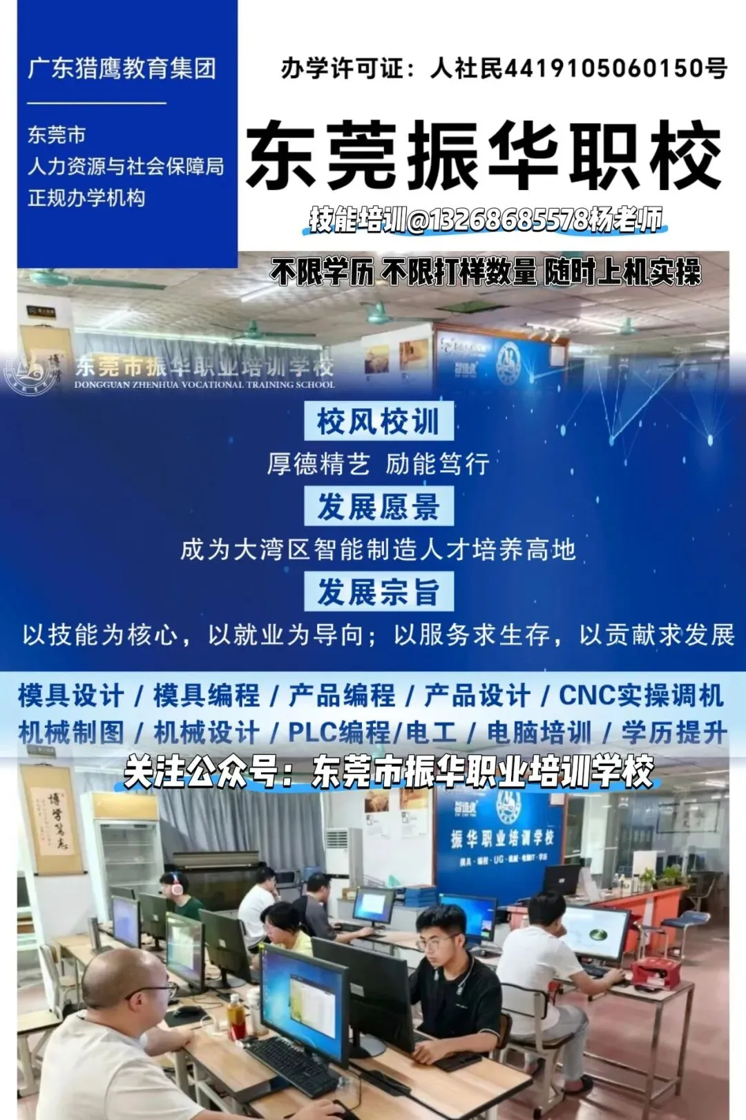 东莞市振华职业培训学校成立于2006年,是由东莞市人社局主管、东莞市民政局登记注册、猎鹰教育集团全资管理的正规职业技能培训学校,学校秉持“以服务求生存,以贡献谋发展”的经营宗旨,不断提升学校软硬件条件,创新“理论+实操+就业”三位一体教学培养模式,振华职校常年开设项目:
