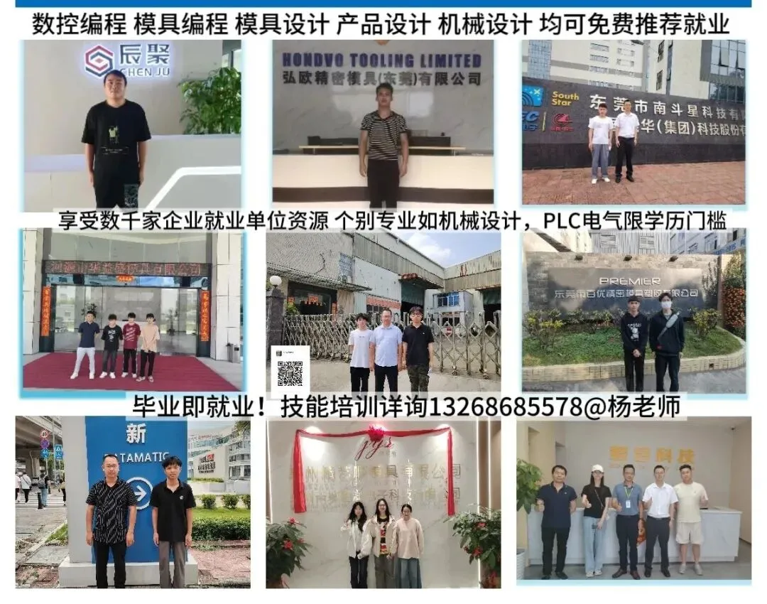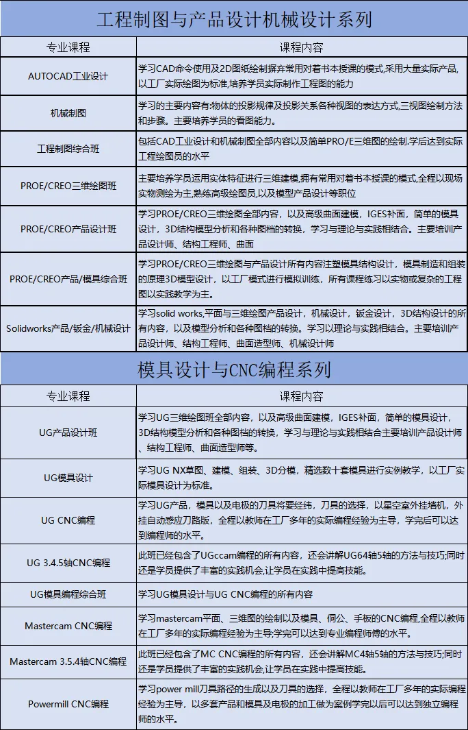 UG数控编程、MC数控编程、数控车床、UG+PM模具编程、硅胶模具编程、模具设计、CAD绘图、UG/CREO绘图、Preo/Creo产品设计、结构设计、Solidworks绘图、Solidworks钣金设计、初/中/高级机械设计工程师、五金模具设计、装配电工、中/高级PLC自动化编程、工业机器人编程、机器视觉等。