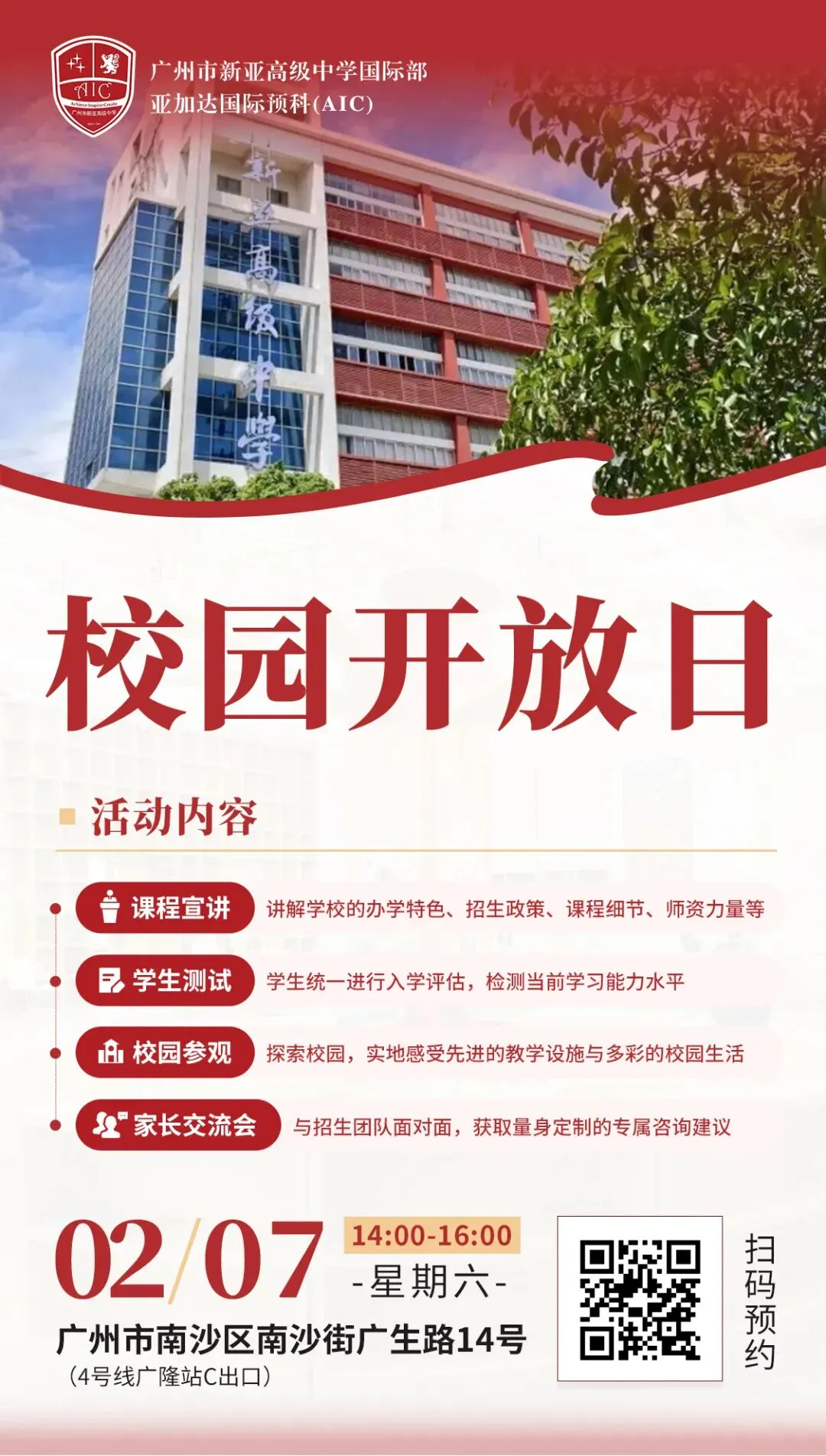 学校的真实办学实力、各项规划的落地情况,唯有实地探访才能真切了解。2月7日,新亚高中国际部将举行首场校园开放日,对学校抱有好奇的家长,不妨预约探校,亲身考察校园环境、深度了解教学理念、课程设置等核心办学信息。