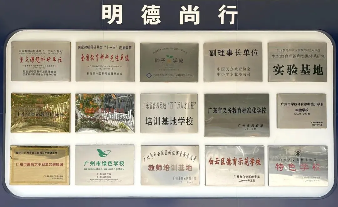 学校推行“以教师发展为前提,以学生发展为目标,以学校发展为保障”的发展模式,文化底蕴深厚,教育理念先进,师资力量雄厚,教学条件优越,学习氛围浓郁。经过50多年的办学沉淀,学校先后获评教育部十一·五“生本”教育基地、国家教师科研基金“十二·五”规划重点课题科研单位、全国教育科研先进单位、中国民办教育特色建设先进学校、全国首批STEM教育种子学校、全国中小学舞蹈教育传统学校、广东省普教系统“百千万人才工程”培训基地学校、广东省依法治校达标校、广东省绿色学校、广州市首批人工智能实验校区、广州市足球推广学校、白云区德育示范学校、白云区义务教育阶段特色学校、白云区“一校一品”艺术特色学校等多项荣誉。