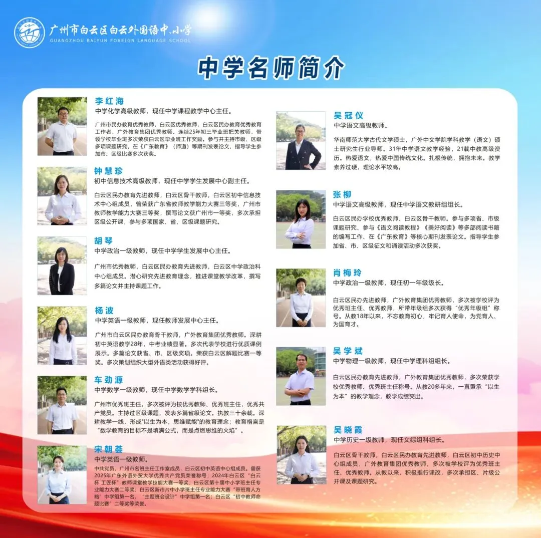 白云山下薪火相传,云溪河畔桃李芬芳。回望历史,广州市白云区白云外国语中小学以励精图治、守正创新的姿态,坚守以人为本理念,落实立德树人根本任务,以科学发展观统领学校发展全局。展望未来,学校将继续深化素质教育实施,强化教学常规管理,以校本教研为抓手,以提升教学质量为核心,以教师专业发展为支撑,为推动白云教育高质量发展贡献力量。