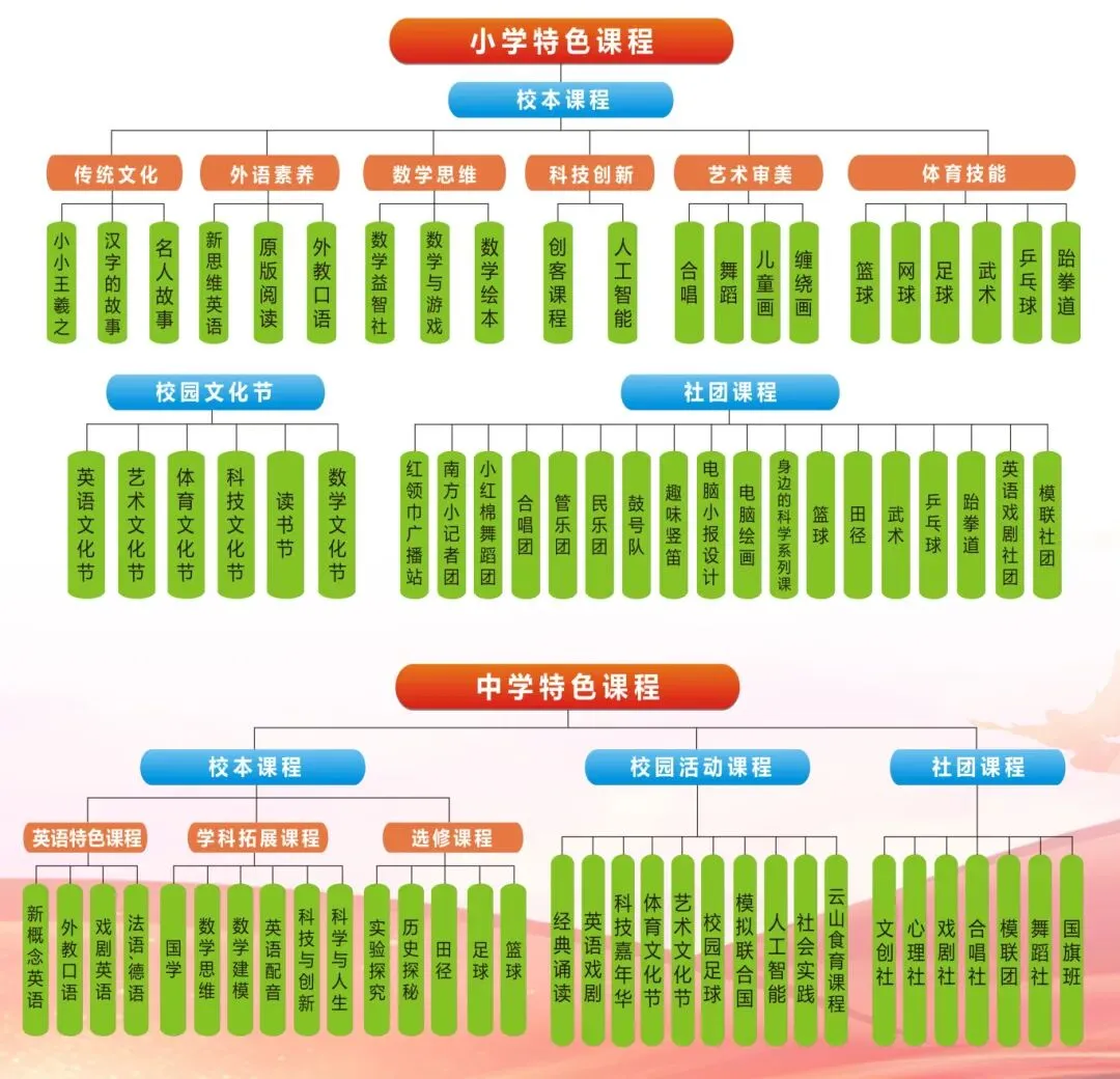 学校按照国家教育行政部门的规定,除开足、开齐所有国家课程和地方课程外,增设校本课程、校园文化节活动课程、社团活动等课程。