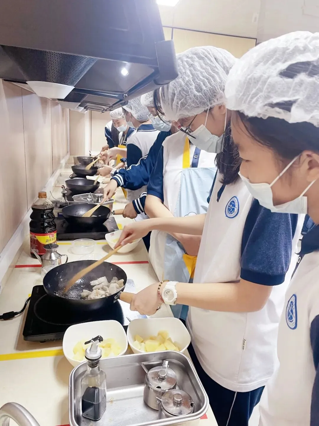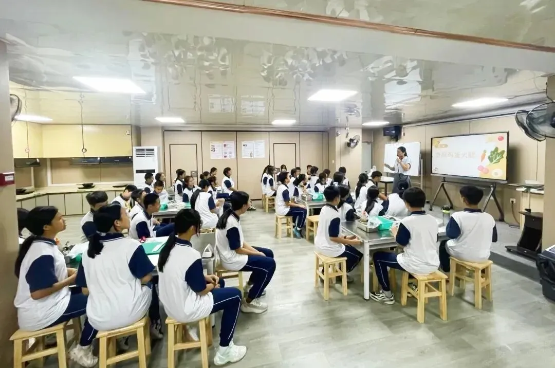2025年,学校开辟饭堂食育劳动实践基地,助推劳动课程的落地实施。本年度率先在小学五年级、初中七年级开设每周1节食育烹饪课,让学生在劳动中掌握饮食知识、提升动手能力,学习安全使用厨具,完成系列食物制作,如水果拼盘、凉拌黄瓜、西红柿炒鸡蛋、香煎火腿、蛋炒饭、土豆烧猪肉、可乐鸡翅等,在体验中培养节约意识、传承饮食文化,促进学生全面发展和健康成长。