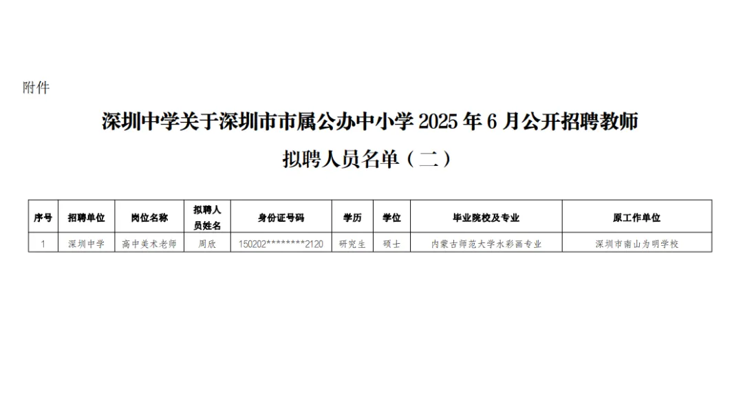 根据《深圳市市属公办中小学2025年6月公开招聘教师公告》有关要求,现对经考试、体检、考察合格的深圳中学招聘岗位拟聘人员予以公示(具体名单见附件)。