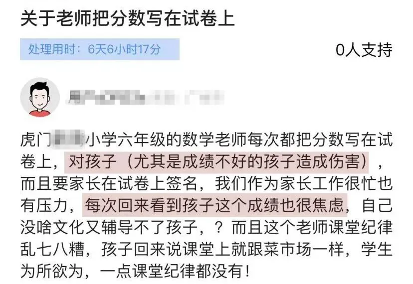 这位家长反映称,孩子的数学老师每次都把分数写在试卷上,还要家长在试卷上签名。他表示,老师这样做对孩子(尤其是成绩不好的孩子)造成了伤害,也给他们作为家长的带来压力。
