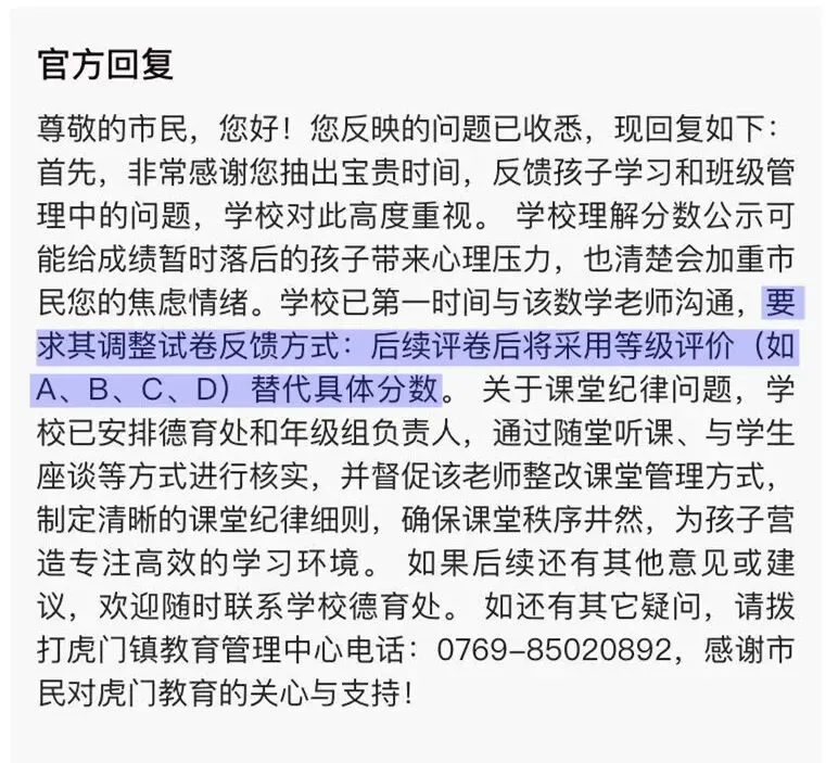 学校已第一时间与该数学老师沟通,要求其调整试卷反馈方式:后续评卷后将采用等级评价(如A、B、C、D)替代具体分数。
