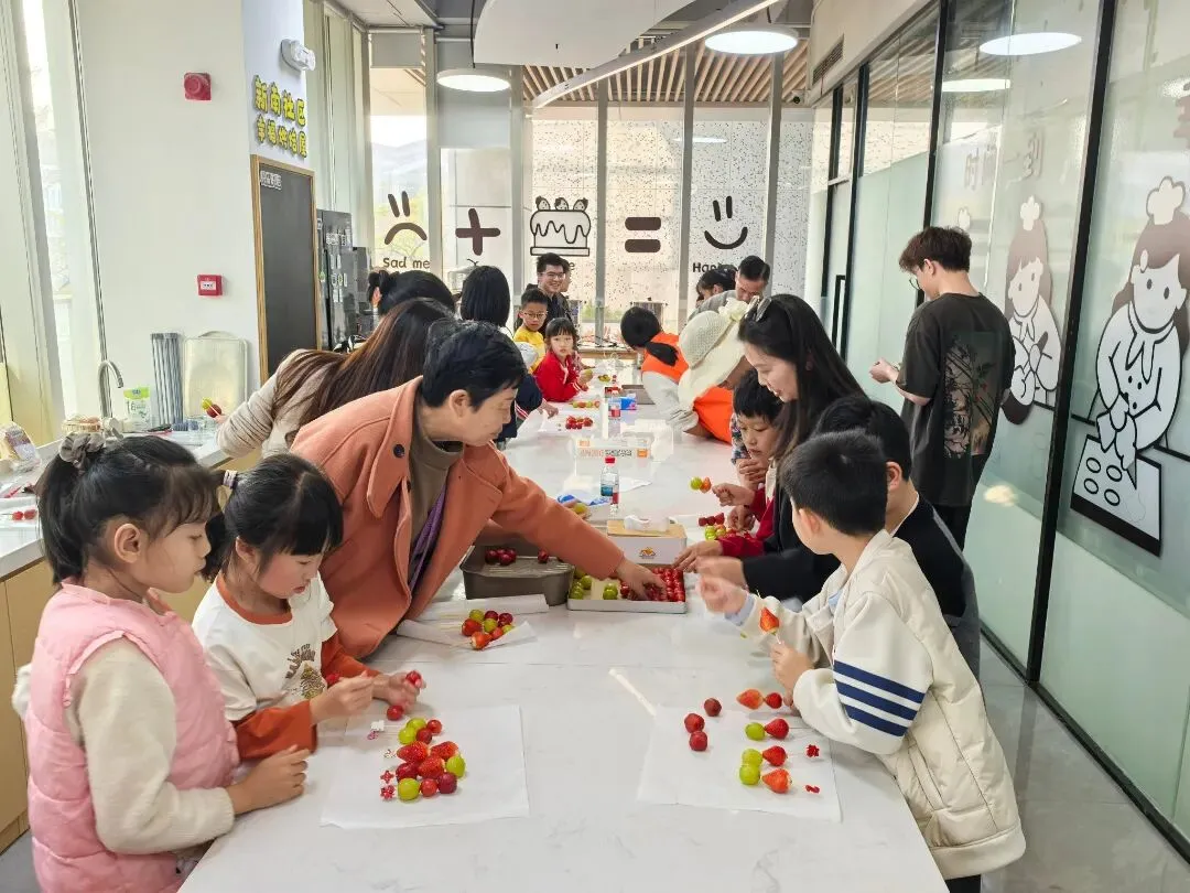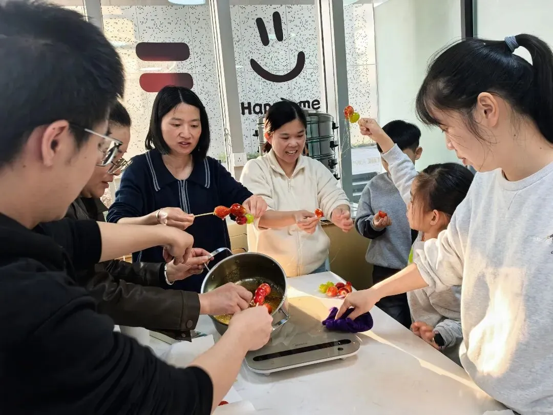 提及新春,甜糯可口的冰糖葫芦便是刻在记忆里的年味符号。工作人员提前备好新鲜山楂、草莓、葡萄、圣女果等食材,以及冰糖、竹签、锅具等工具。大家亲手解锁传统美食,挑选新鲜饱满的果串,看着晶莹的糖浆在锅中慢慢熬制,小心翼翼地为果串裹上糖衣,每一步都充满期待与欢喜。流动党员亲子默契协作,孩子的欢声笑语与家长的耐心指导交织,在动手实践中定格亲情与年味。