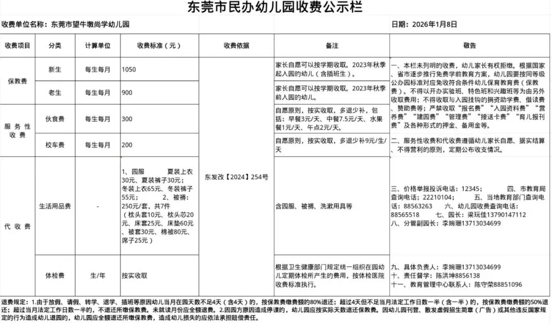 东莞市望牛墩尚学幼儿园2026收费项目及标准