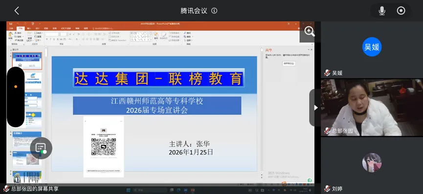 为切实推进2026届毕业生“寒假促就业暖心行动”,搭建高效校企供需对接平台,1月25日晚,中文系与东莞市达达教育投资有限公司联合举办线上招聘宣讲会,为小学语文教育等相关专业毕业生送上精准就业服务,助力学子明晰职业方向、把握就业机遇。