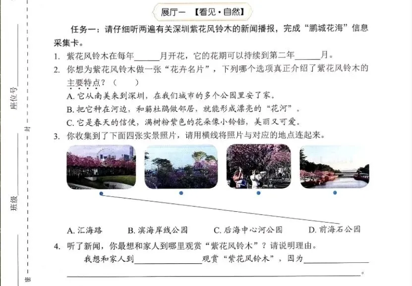 不就是一个听力题,判断一下深圳的紫花风铃木花期,把照片与对应的四个公园连线吗?这会比小学英语的听力判断和连线难?而且,这样的环境,不就是跟气候土壤相匹配的吗。
