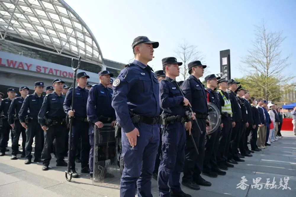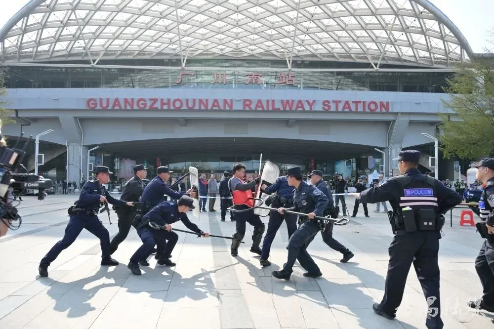 随后的治安事件处置环节,更考验各部门协同处置效率。演练模拟售票厅内一名 “旅客” 情绪激动、持刀对峙的突发警情,相关警情通过路地联勤机制一键同步传达。广州南站派出所与新客运站派出所迅速协同响应,通过战术配合与有效警告,快速控制事态并带离嫌疑人,充分展现了高效的应急处突能力。