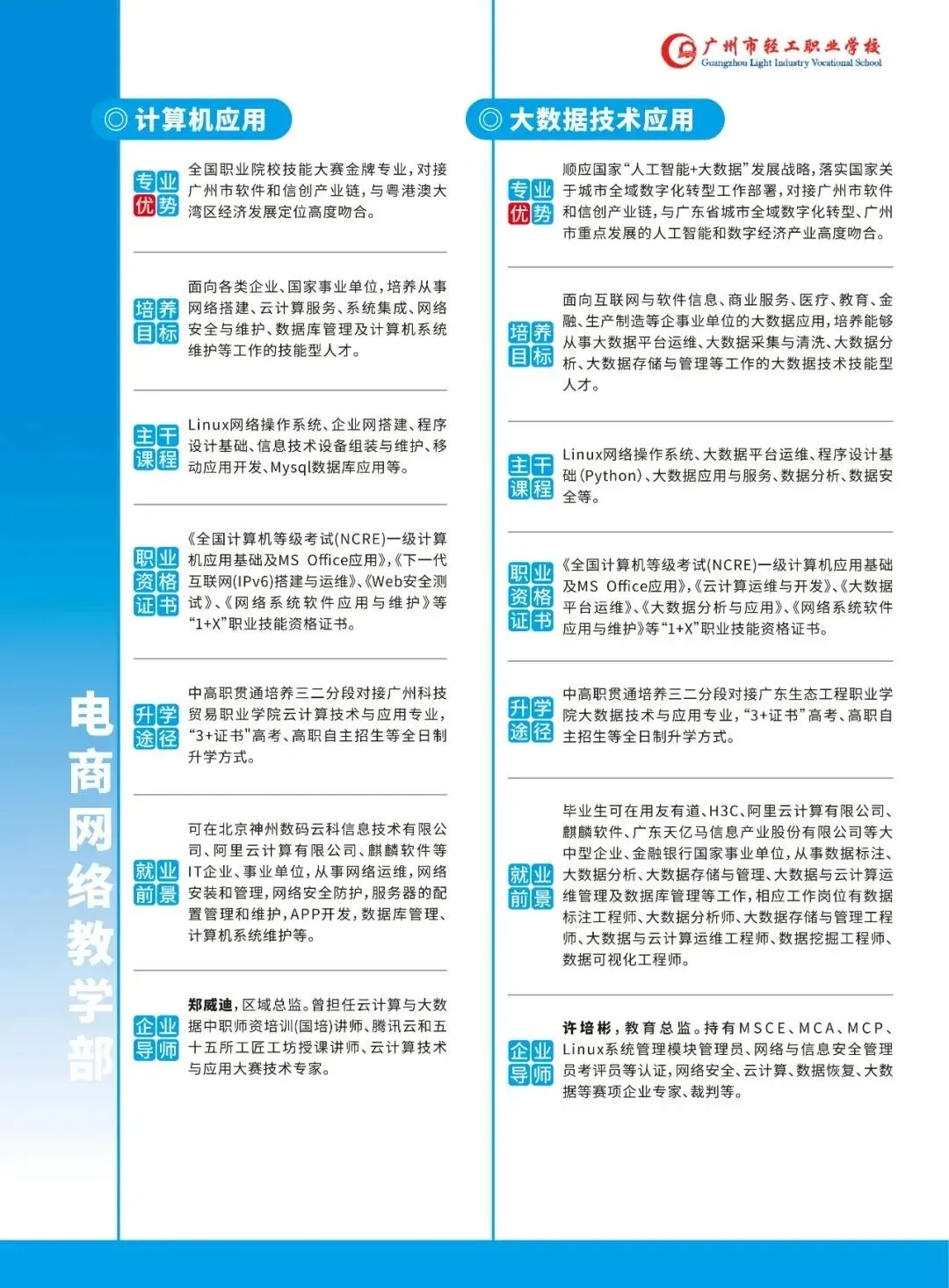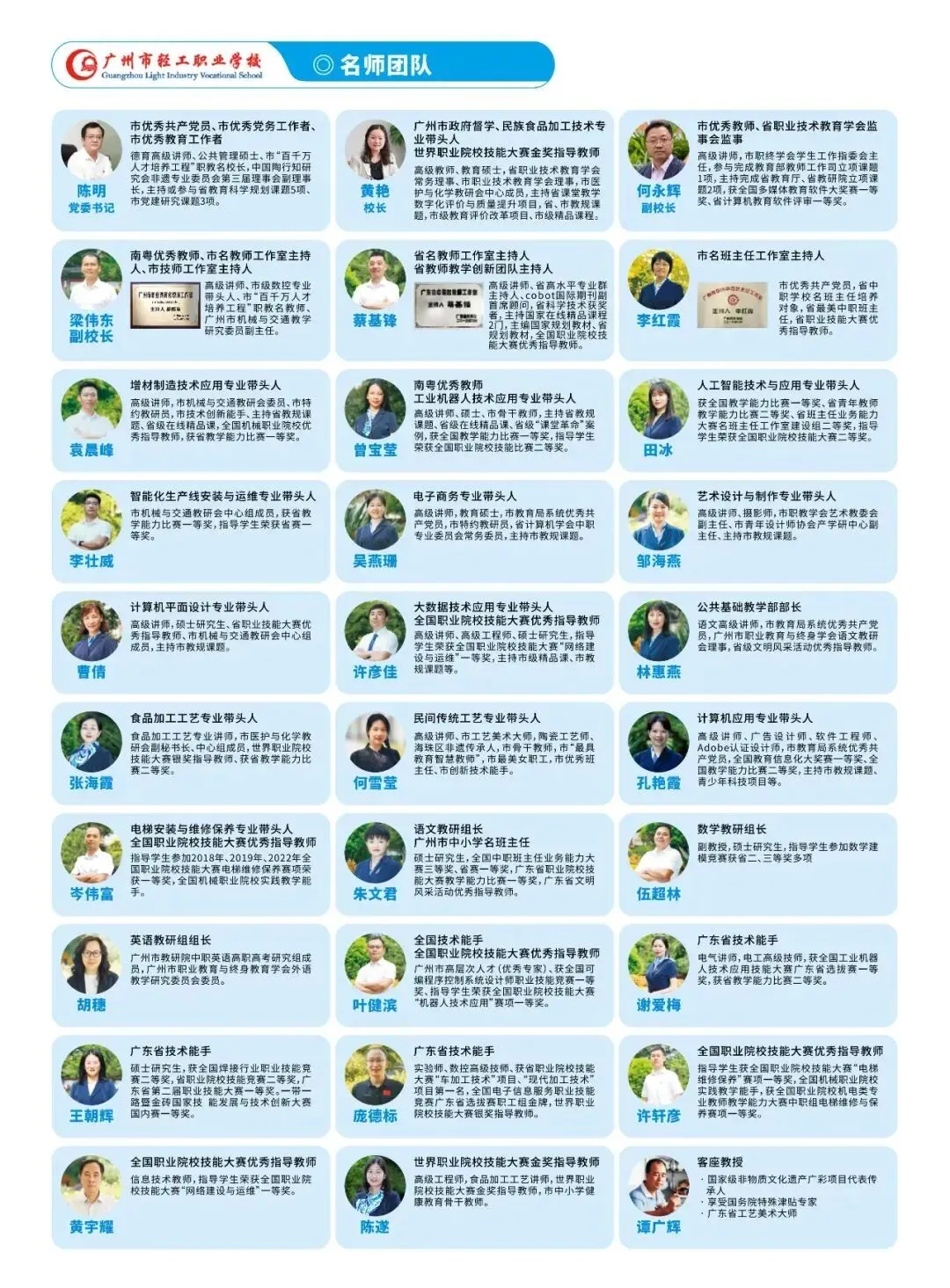 师资队伍实力雄厚。拥有南粤优秀教师、省中职名师工作室主持人、市中职名师工作室主持人、省市级教师教学创新团队、最美广东中职班主任、市名班主任工作室主持人、市级名班主任、市骨干班主任、市十佳班主任、拥有全国技术能手、全国职业院校技能大赛优秀指导教师以及市高层次人才等名师队伍。