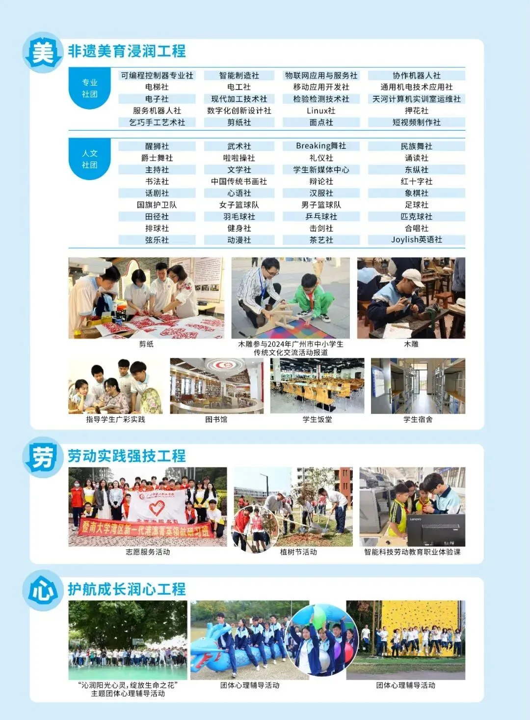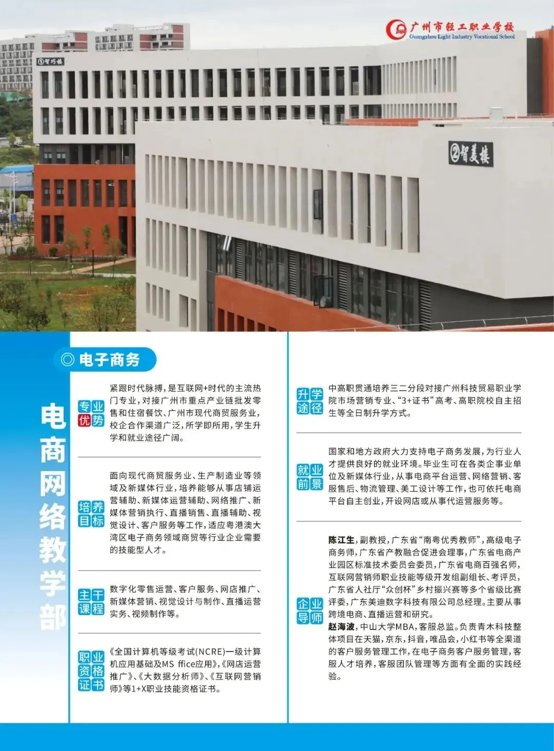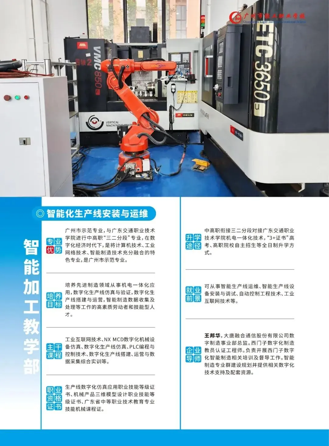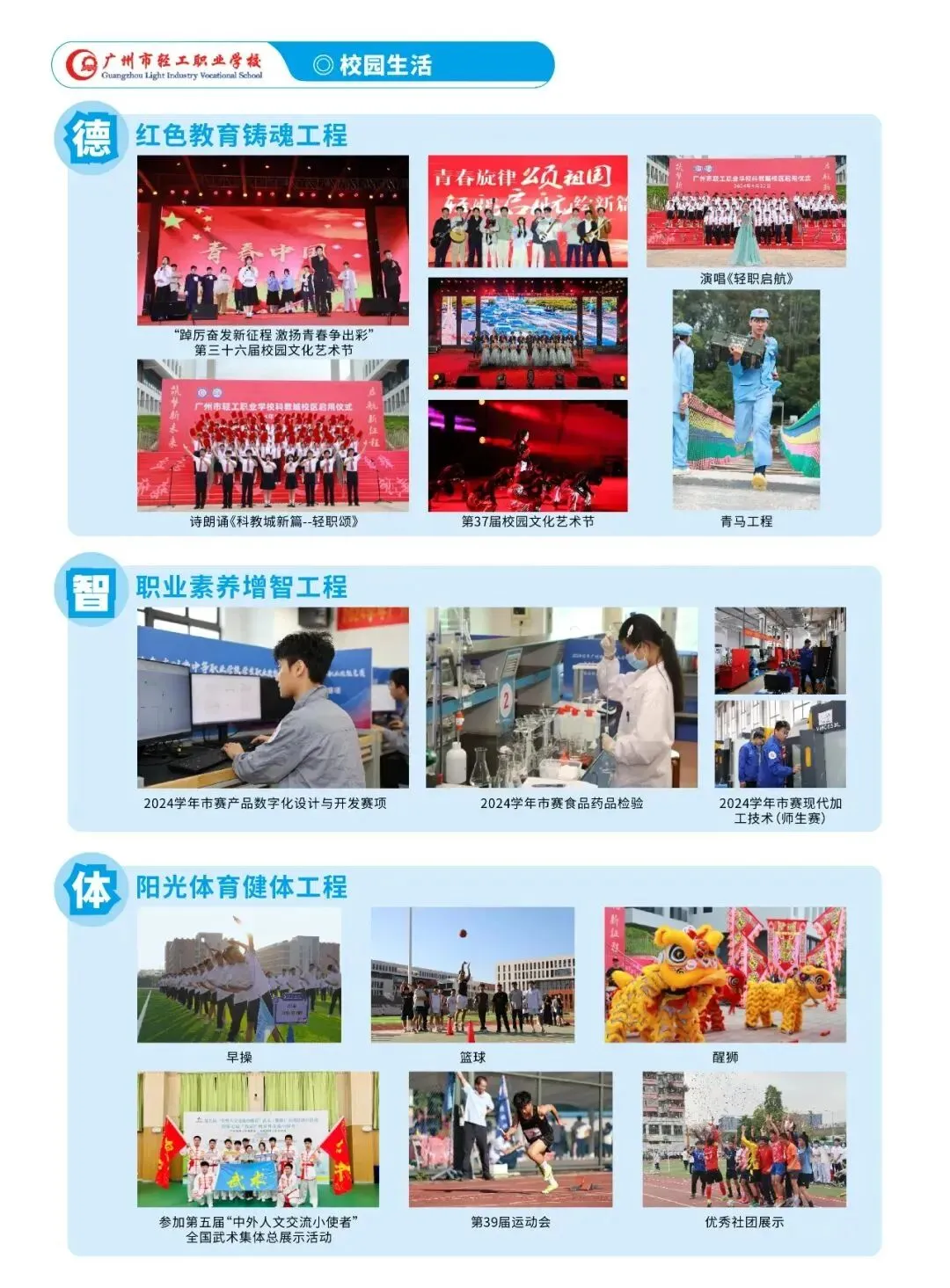广州市轻工职业学校是广州市教育局直属的唯一以智能制造专业为主的公办中等职业学校。创建于1958年,建校60多年,历史悠久、文化深厚,是首批国家级重点中职学校、广东省高水平中职学校。学校坚持 “崇德树人、强技育人、生利成人”的办学理念,秉承“立志、勤奋、自律、创新”的校训,弘扬“厚德、博学、笃行、致远”的校风,“尚德、和悦、善导、赏识”的教风,“崇德、乐学、善思、强技”的学风,培育了4万余名高技术技能人才。