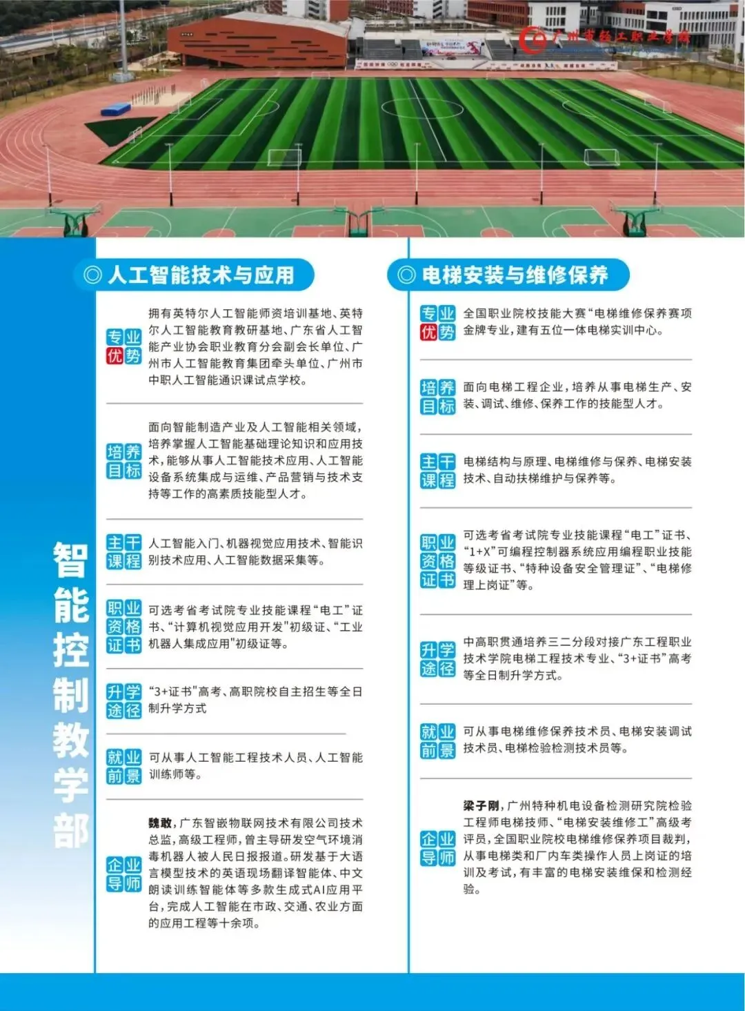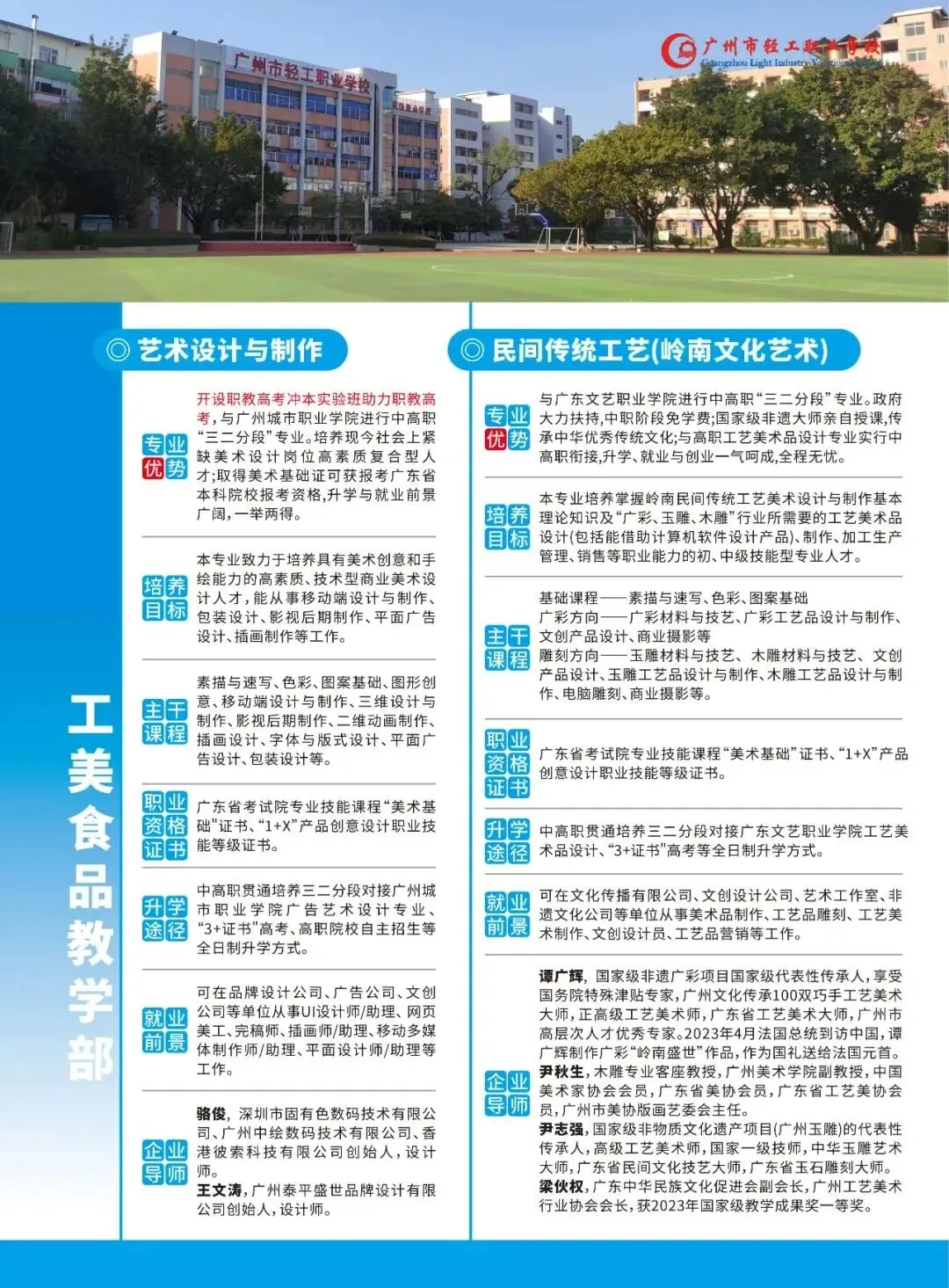 多元途径,升学有优势。学生可通过三二分段、“3+证书”考试、自主招生、现代学徒制等方式升读大专、本科。学校作为首批广东省教育厅五年制“三二分段”中高职贯通培养专业试点学校,与十余所公办高职院校实施中高职贯通人才培养,直接升读对口学院就读全日制公办大专。实施“职教高考英才培养计划”,为学生参加“3+证书”高考提供助力,学生本科、专科文化课上线人数、获证率全市领先。积极探索中职、高职和企业三方合作开展现代学徒制培养,进一步拓宽学生成长、成才通道。与新西兰北方理工等大学建立合作,学生可以选择到国外高等院校留学深造。