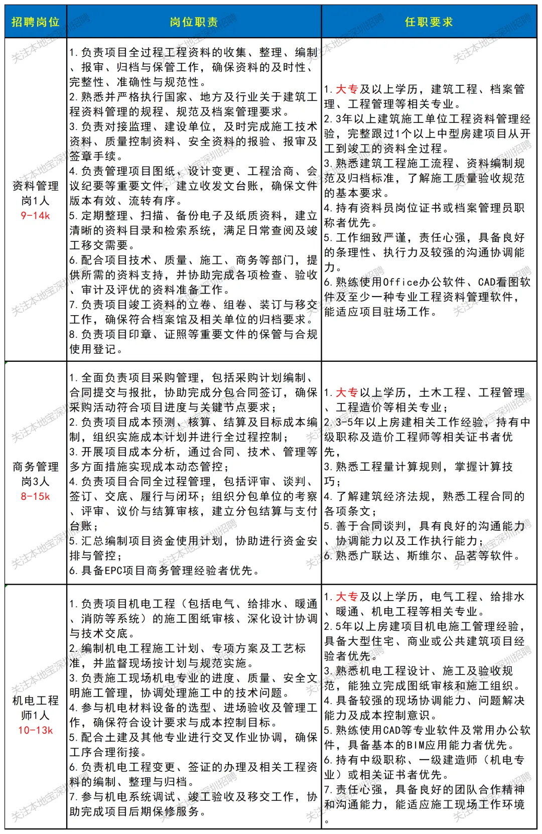 1月27日发布了机电工程师、技术质量岗、资源管理岗、商务管理岗、安全管理岗、施工管理岗6个社招岗位,全部大专可报,岗位展示及薪资范围如下图所示