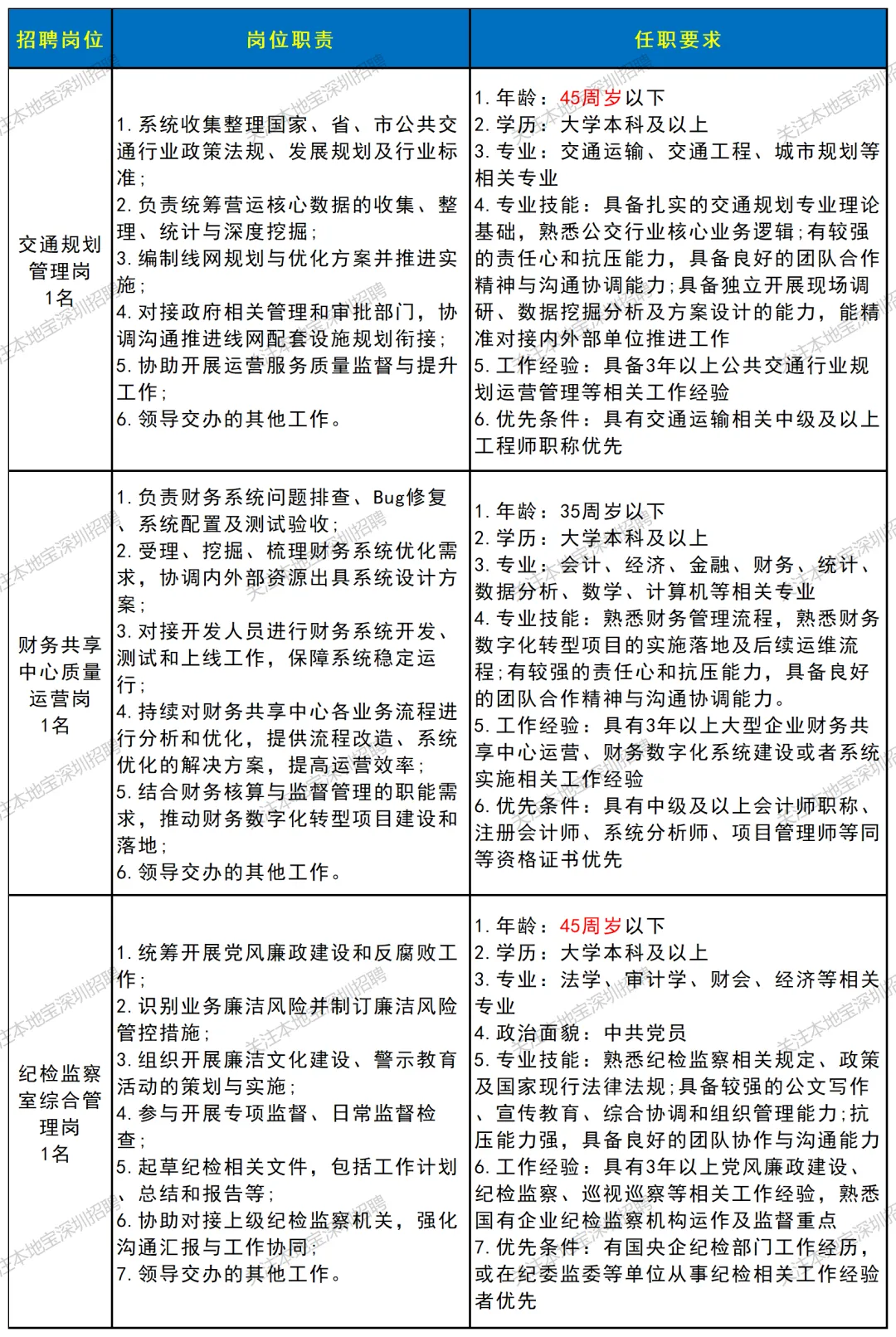 招聘财务共享中心质量运营岗、交通规划管理岗、纪检监察综合管理岗,一共3人,具体要求如下图所示