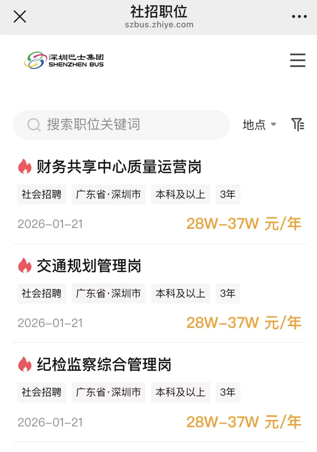 提示:虽然招聘公告里面没有写薪资范围,但是深圳巴士集团官网,是有写哦,年薪28w-37w!另外深圳巴士集团也在深i优才官网上面也上线了这几个岗位,上面除了显示薪资范围,也介绍了福利(部分),包含周末双休、五险一金、定期体检、带薪年假,仅供参考