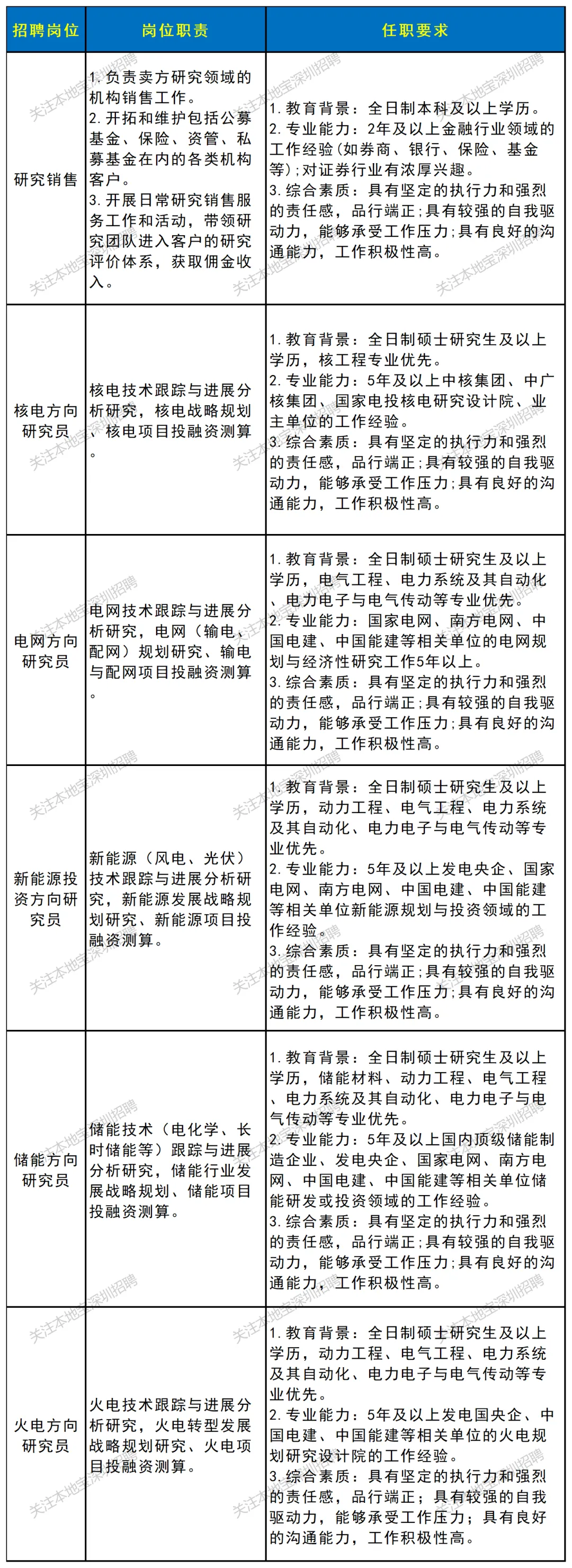 1、长城证券产业金融研究院:招聘研究销售8人、核电方向研究员2人、电网方向研究员2人、新能源投资方向研究员3人、储能方向研究员2人、火电方向研究员1人,具体要求如下图所示