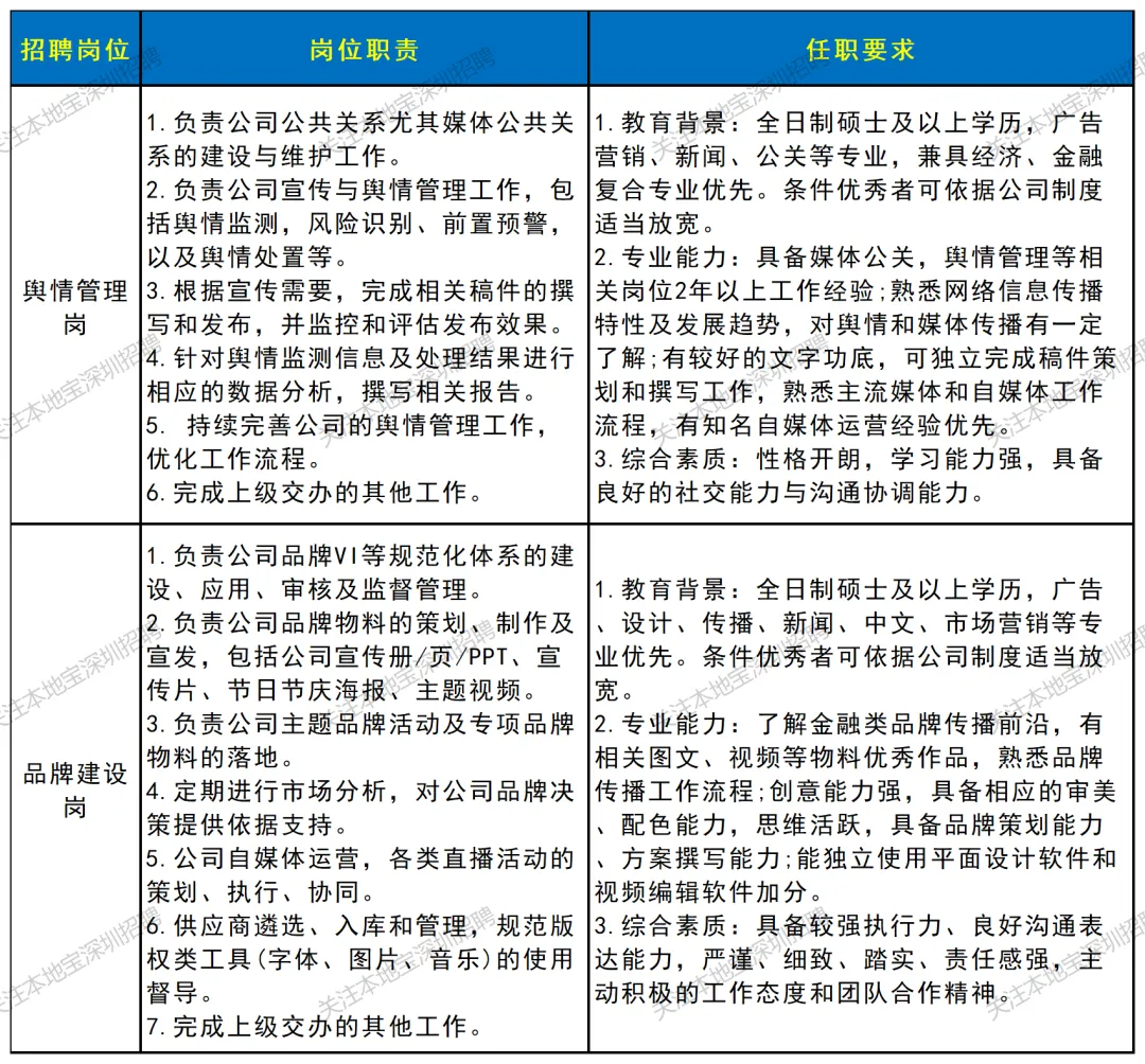 2、长城证券品牌与公共关系部:招聘舆情管理岗1人、品牌建设岗1人,具体要求如下图所示