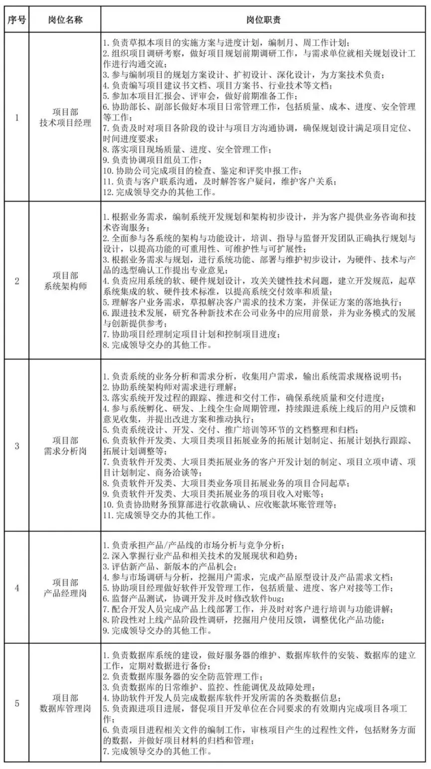 招聘合同制员工6名,其中技术项目经理1名、系统架构师1名、需求分析岗1名、产品经理岗1名、数据库管理岗2名。具体岗位职责及任职要求如下两图所示