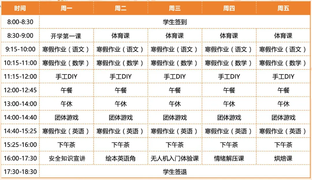 丰富的课程表为您送上,从寒假素质拓展作业辅导、到身体开发、社交、素质提升等特色课程,周一到周五已给你的孩子安排好,收获满满~