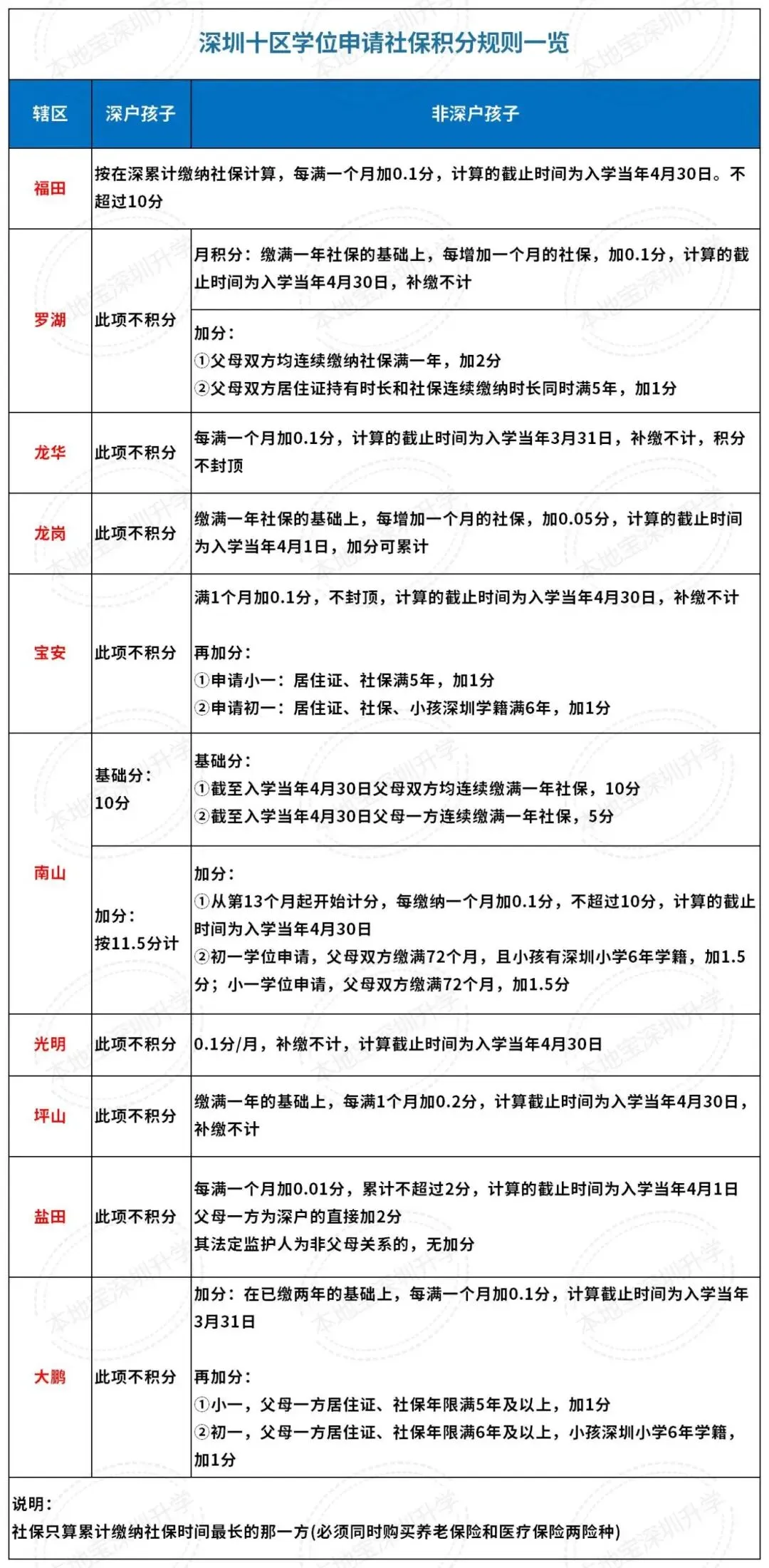 可以看到,福田、南山的深户有社保的加分项目,其他区的深户都是不能用社保积分的