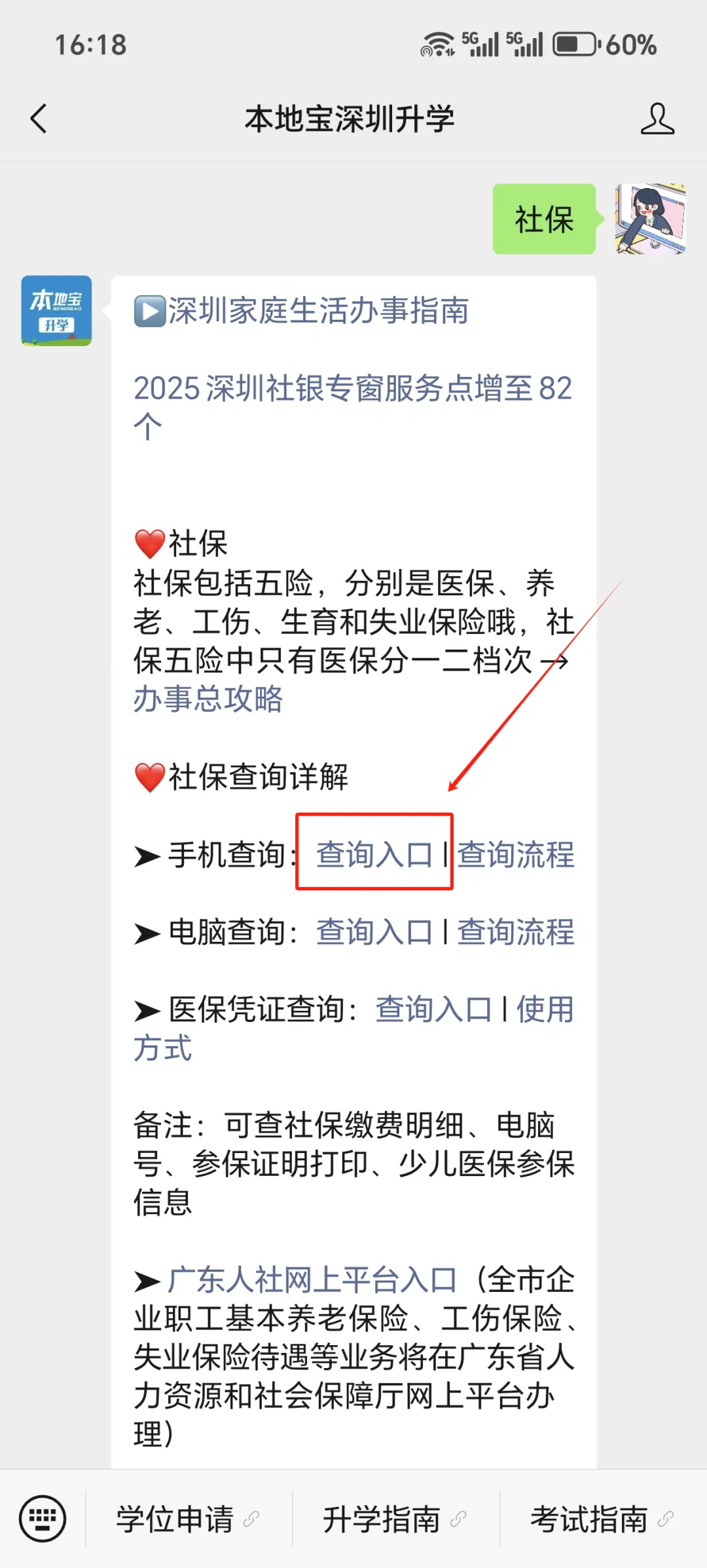 在“深圳社保”公众号,或者长按下方二维码,进入【本地宝深圳升学】回复【社保】,按照下图指引进入社保查询入口