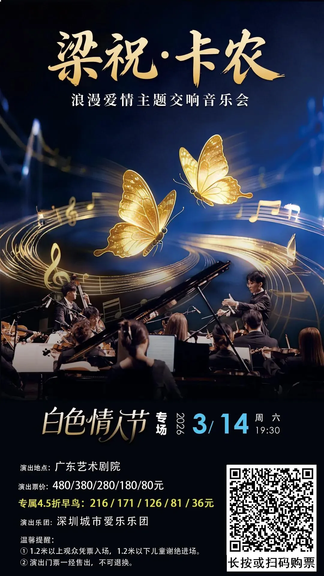 当晚风轻拂广东艺术剧院,20名顶尖演奏家同台落座,一场以爱为名的交响音乐会,正等待每一对情侣赴约《梁祝&卡农——浪漫爱情主题交响音乐会》,用最磅礴的交响韵律,诉说藏在旋律里的深情与眷恋。