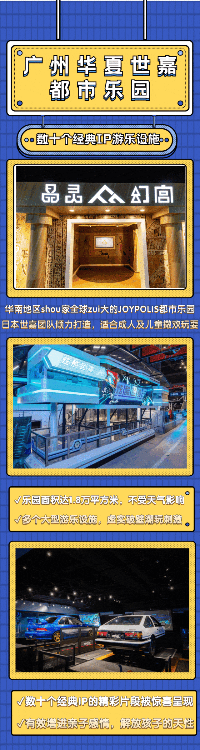 3、广州钧明欢乐世界位于广州增城永宁街道,占地约9万平方米,总建筑面积约18万平方米,共有四个室内IP乐园,分别为全年龄段通玩的广州华夏世嘉都市乐园、《穿越火线:火线战场》综合乐园,适合低年龄层少儿玩耍的刺猬索尼克乐园、可可乐园两大儿童乐园
