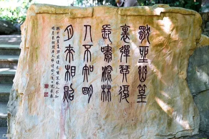 这块石刻一共是二十个字,别看采用篆书题写,但很多人都能认出来,不=是因为有释文,主要还是这首诗以前语文课都学过,辨认出其中几个好认的字也差不多能猜到是哪首诗了。