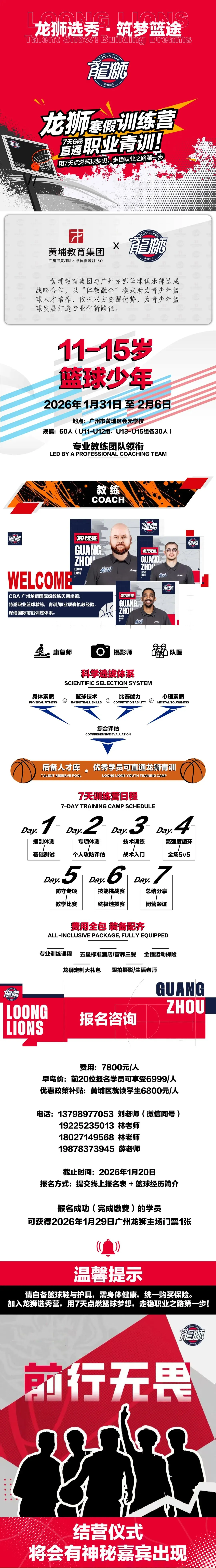 这个寒假,与广州龙狮篮球俱乐部并肩作战!依托黄埔教育集团与广州龙狮篮球俱乐部的战略合作优势,我们以“体教融合”创新模式,为热爱篮球的青少年铺设一条通往职业梦想的专业化道路。7天封闭式高强度训练,点燃你的篮球火种,迈出坚实的第一步。