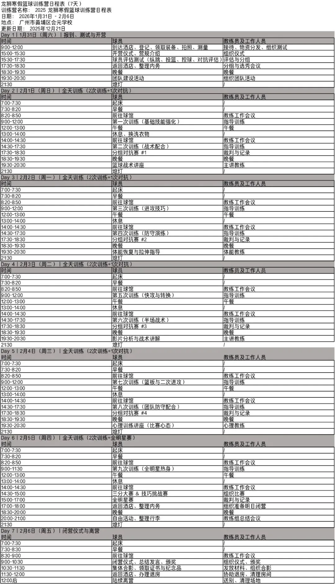 日程亮点:训练营以“评估-训练-选拔”为主线。开营日即进行全面的身体素质与技能评估测试。随后五天,每天安排两次高强度专项训练(涵盖基础技能、攻防技巧、战术配合、快攻转换、篮板球、团队防守等)及分组对抗赛,晚间辅以战术讲座、影片分析、心理训练等课程。第六天举办精彩的三分大赛、技巧挑战赛及全明星赛。最后一天举行闭营仪式,颁发证书与纪念品。